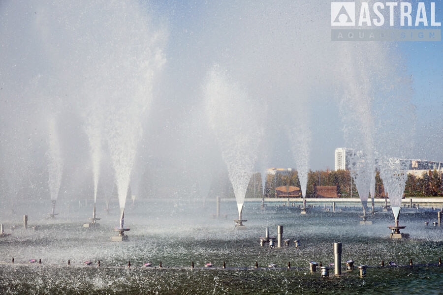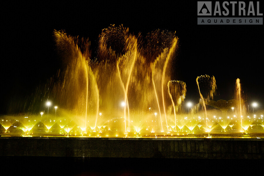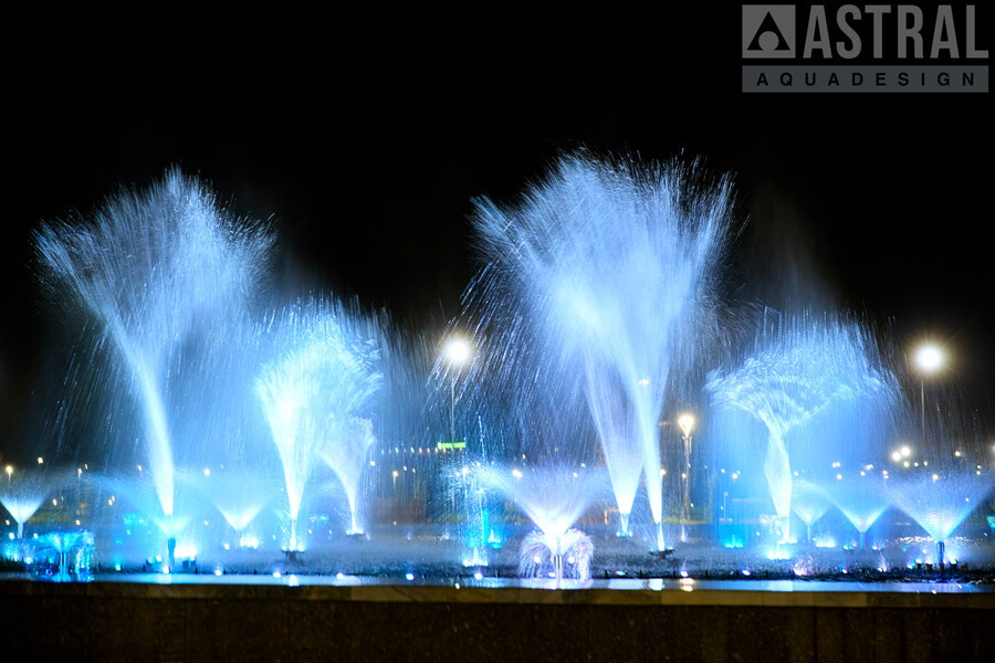При создании этого уникального Водного шоу были применены новейшие технологии и оборудование Astralpool, а именно роботизированный форсунки, механизмы отсечки, насосы со встроенными частотными преобразователями, сверхмощные светодиодные RGBW светильники с управлением по протоколу DMX и т.д.