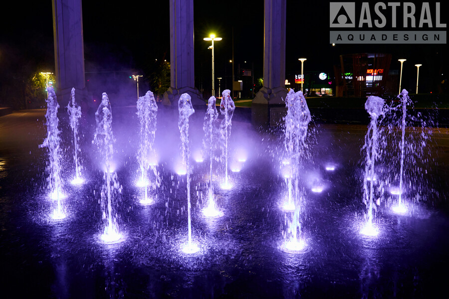 Пешеходный светодинамический фонтан был построен в этом году возле университета ГазКаса в Алматы в рамках благоустройства территории. Фонтан состоит из 25 динамических струй высотой до 2,0 метров. Форсунки управляются 25 быстродействующими подводными клапанами и 1 насосом мощностью 5,5 кВт/380В с частотным регулированием. Водная картина дополнена системой "мягкого" тумана, который превосходно смотрится в ночное время благодаря работе кольцевых светодиодных светильников 45Вт/24В. Общий диаметр фонтана составляет 8,0 метров, до водосборного лотка 7,1 метра.