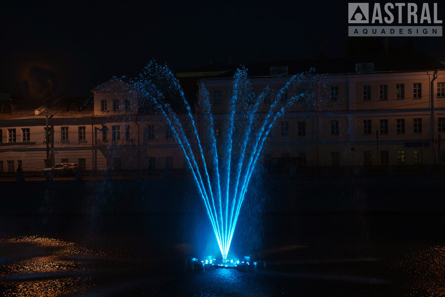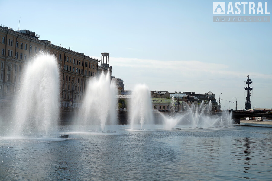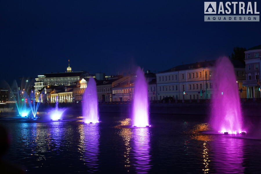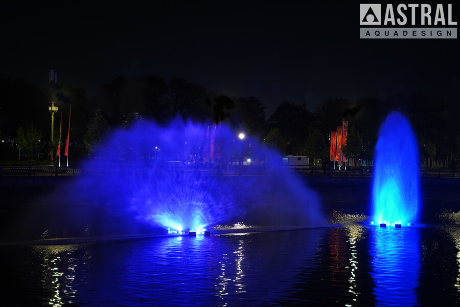 Уникальный фонтанный комплекс из 17 плавающих модулей с подсветкой открыли в Москве в мае этого года. Высота струй составляет от 8 до 14 метров, мощность насосов от 7,5 до 15,0 кВт. Комплекс состоит из разнообразных водных фигур, таких как Букет, Сияние, Гейзер, Скипетр, Лилия и Водный экран. Все фонтаны освещаются в вечернее время светодиодными прожекторами серии RGBA.