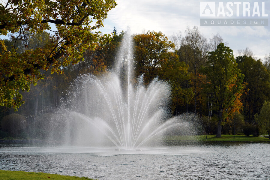 Водная картина представленного фонтана состоит из центральной струи диаметром 25 мм, 12 форсунок 14 мм на первом ярусе и 12 форсунок 10 мм на втором. Водный узор 15 х 25 метров освещается светильниками RGB 27Вт в количестве 16 шт. Насос мощностью 15 кВт управляется электрическим шкафом с частотным регулированием.
