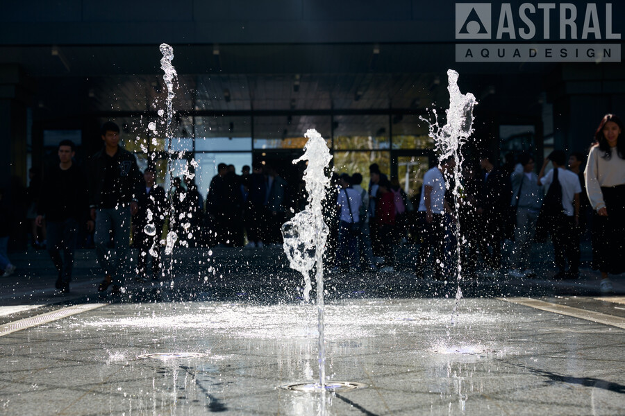 Еще один сухой динамический фонтан был запущен в сентябре 2023 года возле университета ГазКаса в Алматы в рамках благоустройства территории. Фонтан состоит из 13 динамических струй высотой до 2,0 метров. Форсунки управляются 13 быстродействующими подводными клапанами и 1 насосом мощностью 3,5 кВт/380В с частотным регулированием. Водная картина дополнена системой "мягкого" тумана, который превосходно смотрится в ночное время благодаря работе кольцевых светодиодных светильников 20Вт/24В. Общий габаритный размер фонтана составляет 12х4 метра.