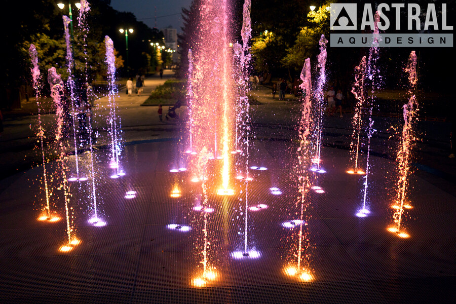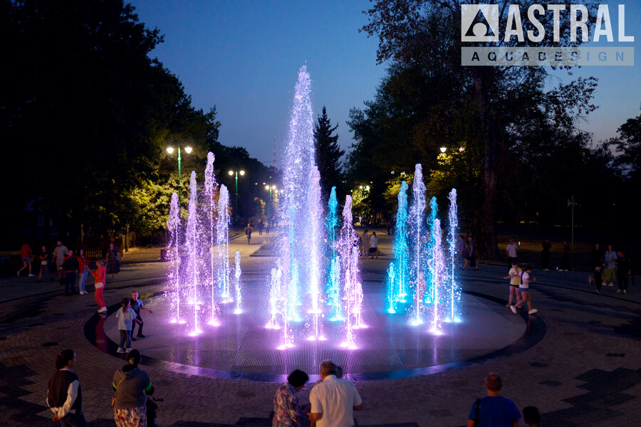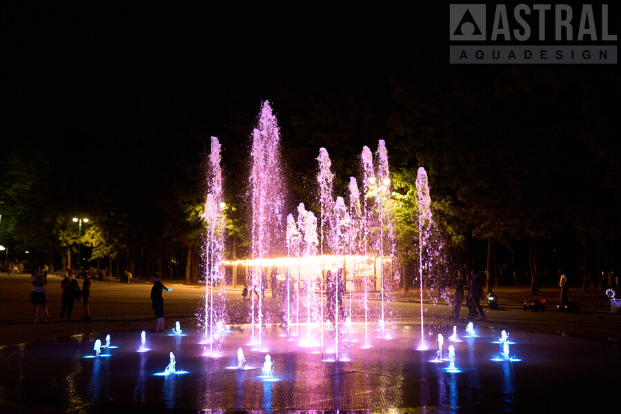 Внешний диаметр фонтана составляет 11 метров. Струи расположены по нескольким контурам, где центральная струя толщиной 20 мм достигает 6,0 метров, 12 струй по 16 мм до 4,0 метров и 18 струй, также по 16 мм, до 3,0 метров. Все струи подсвечиваются светильниками RGBW, по 2 на каждую форсунку, а именно на центральную струю 2 х 32Вт, а на все остальные 2 х 16Вт.