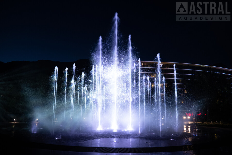 Фонтан представляет собой сооружение круглой формы диаметром 18,0 метров и состоит из 140 динамических струй. Высота водной картины достигает 20,0 метров. Струи управляются по 82 каналам, за счет системы частотных преобразователей насосов, быстродействующих клапанов и форсунок-роботов. Фонтан имеет 12 контуров неповторимых водных фигур с соответствующей светодиодной многоцветной подсветкой и 8 режимов работы. В дополнении фонтан укомплектован световыми головами, огненными форсунками, интерактивными кнопками, проектором и лазером.