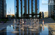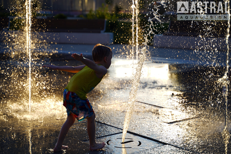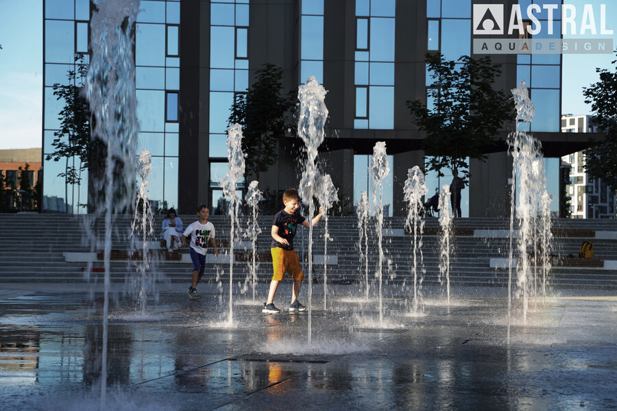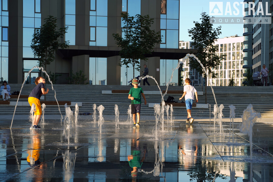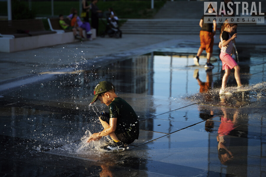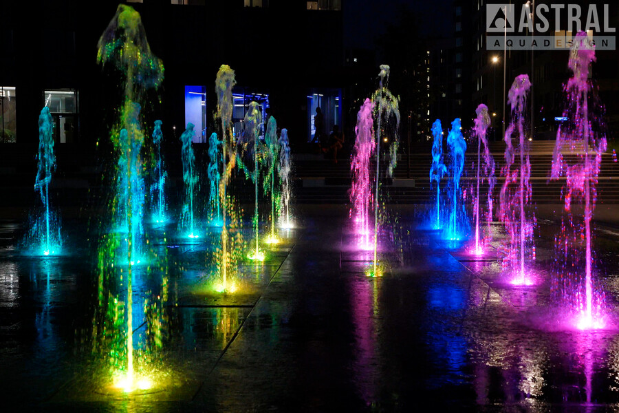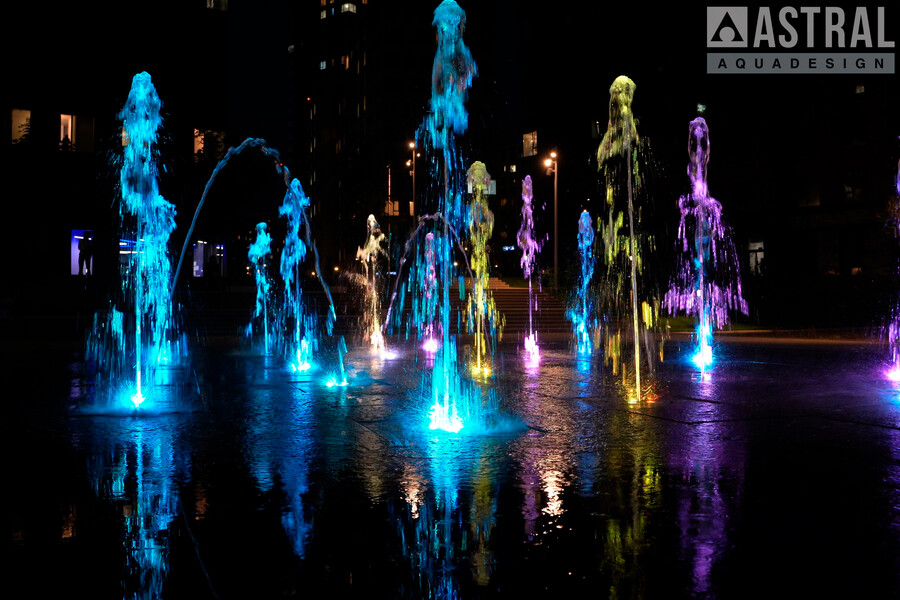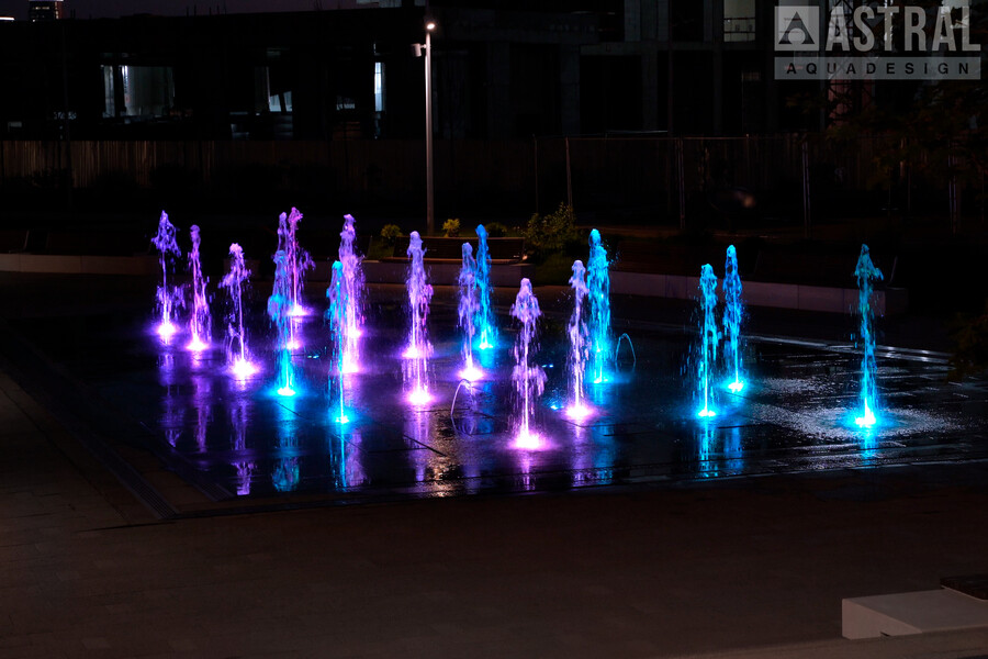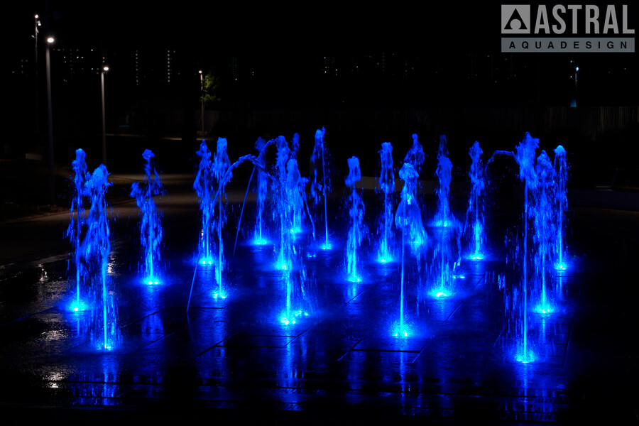 Фонтан формы неровного прямоугольника размером 20х12 м состоит из 20 вертикальных струй высотой 1,8 м и 3 параболических 1,5 м. Работу фонтана обеспечивают подводные насосы Astralpool Variable Pump S DMX 100Вт/24В и кольцевые светильники Circular 200 также с управлением DMX модели RGBW 16Вт/24В.
