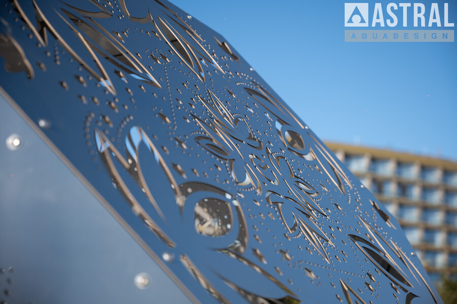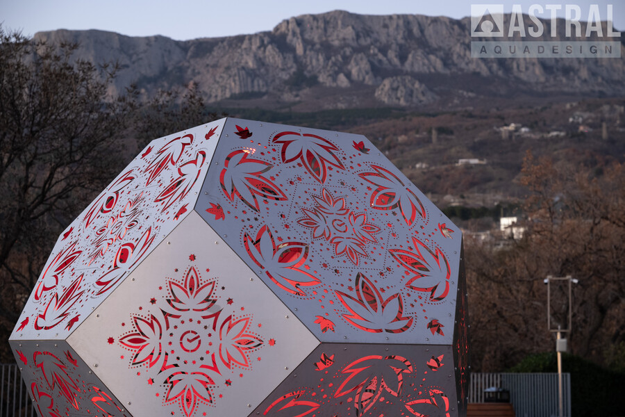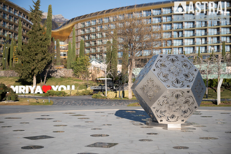 Специалисты нашей компании разработали уникальную арт-инсталляцию из нержавеющей стали с подсветкой RGB. Конструкция размером 2,5 х 2,4 метров состоит из 14 граней, где 12 из них обладают индивидуальным рисунком. В данном случае это изображение логотипа Сбер и СПА-Отеля Мрия.