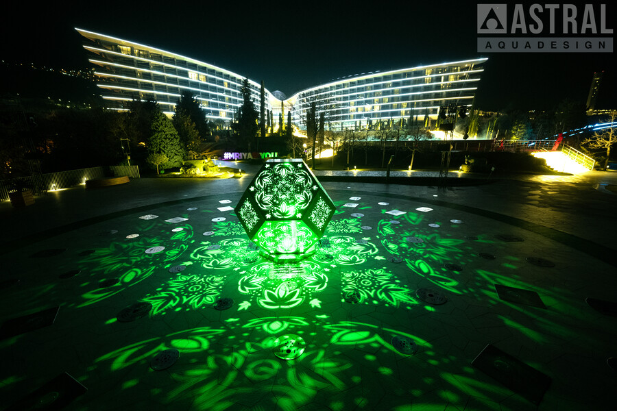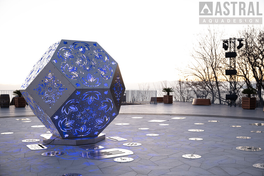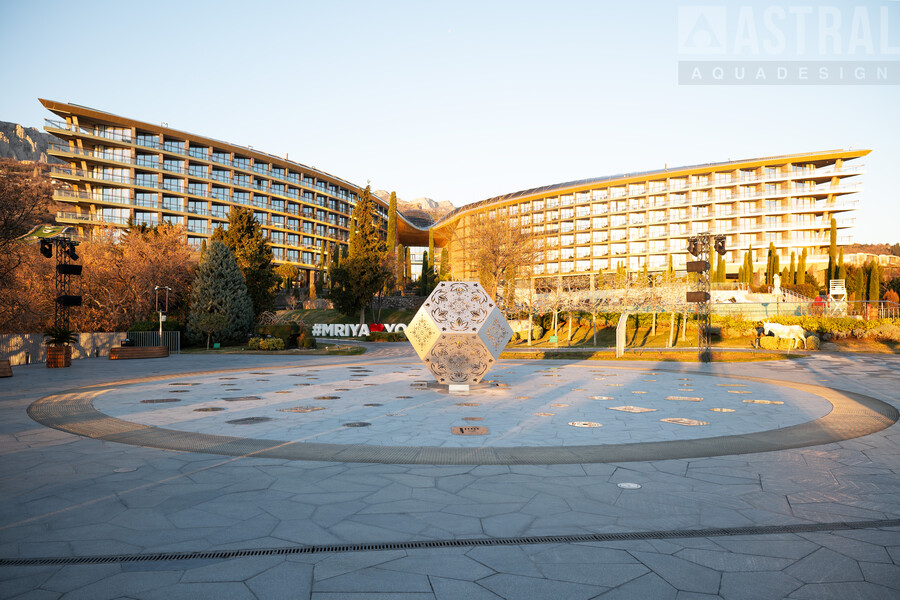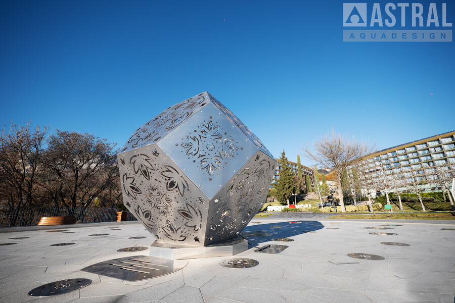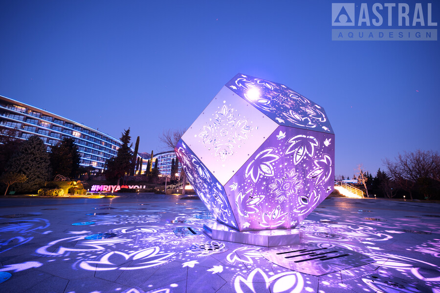 Арт-инсталляция "Куб" высотой 2,5 м из нержавеющей стали на пешеходном фонтане, Mriya Resort & SPA