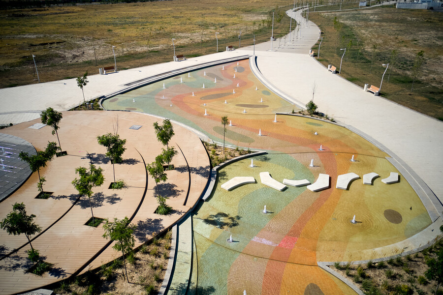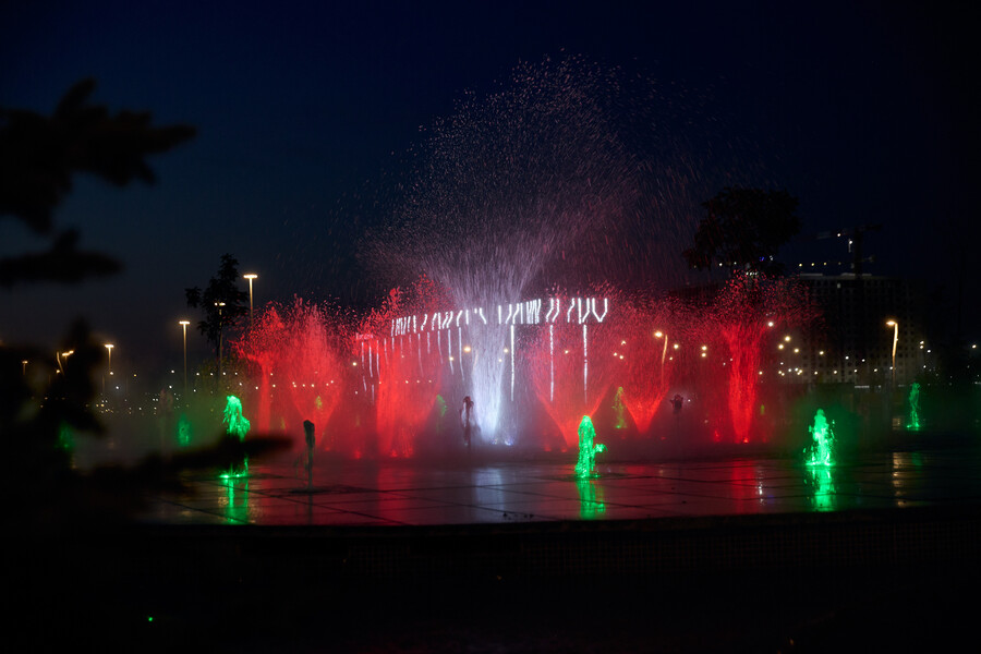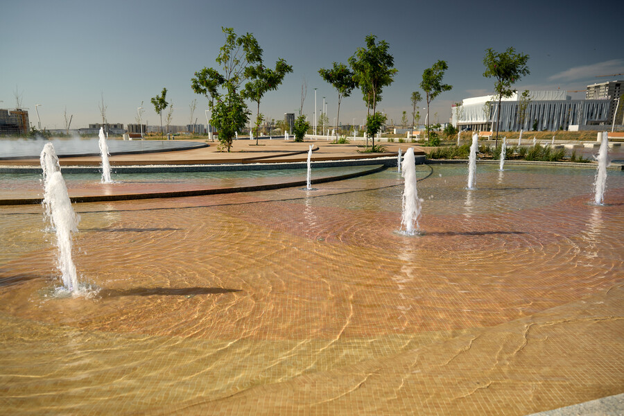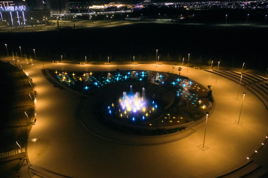 В данном проекте отличным образом сочетаются разнообразные водные эффекты, используемые при строительстве новых современных объектов. Здесь и пешеходный фонтан, и плескательный бассейн, и каскад, и перелив, и зеркальный водоем. Первый запуск произошел в мае 2025 года и полностью введен в эксплуатацию в июле. Комплекс расположен на территории парковой зоны Административно-Делового района "Шымкент Сити" в городе Шымкент (Казахстан).