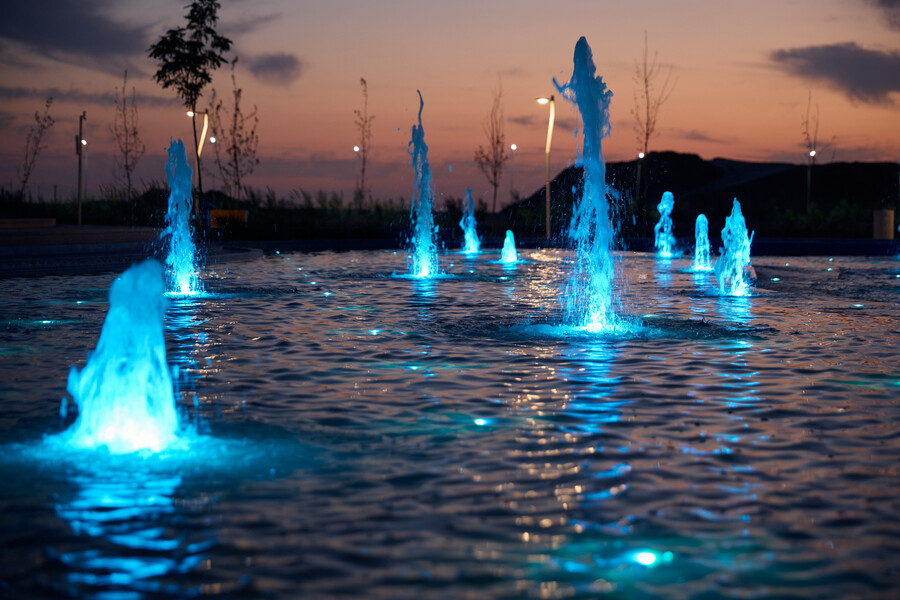 В фонтане применены форсунки с изменяемой формой струи Swap Jet S - 9 шт. и светодиодными светильниками RGBW DMX - 36 шт., туманообразующие форсунки - 128 шт., насадки с пенным эффектом и кольцевые светильники RGBW DMX - 36 шт., моноструйные форсунки и кольцевые светильники RGBW DMX - 50 шт., точечные светильники RGBW DMX - 214 шт. Это новый уровень реализации архитектурного паркового фонтана, построенного при участии нашей компании.