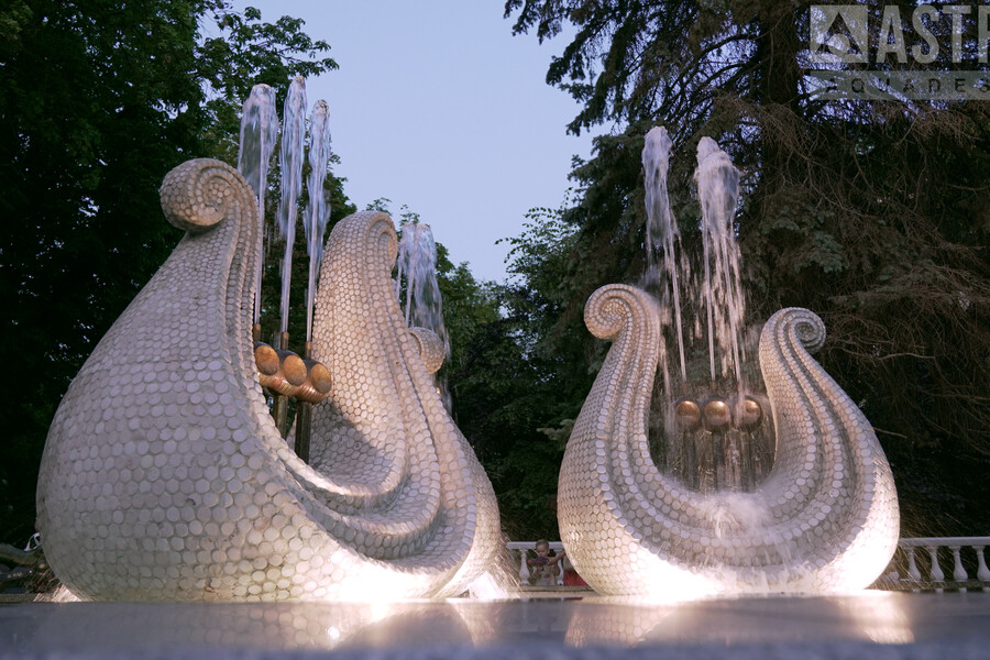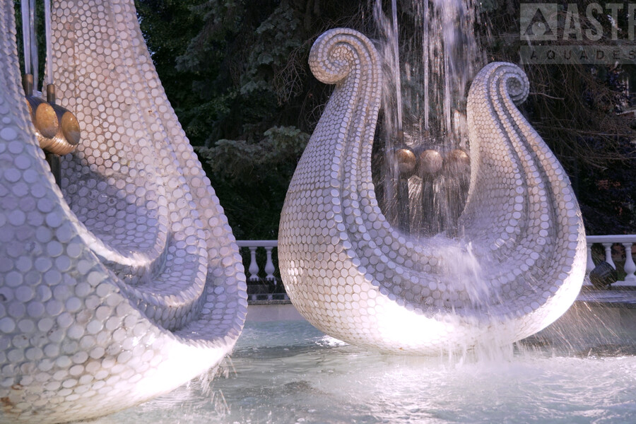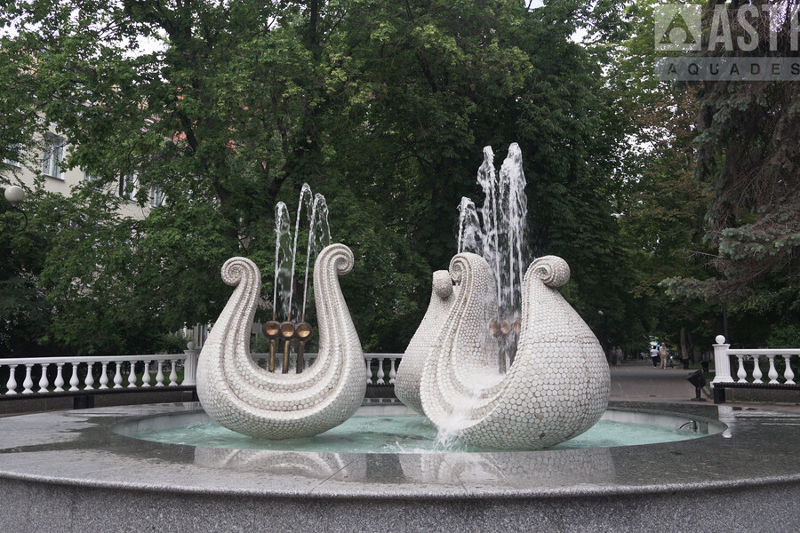 В круглой чаше диаметром 7,5 метра располагаются три скульптуры, покрытые мозаикой, своими формами напоминающие древнегреческий музыкальный инструмент - лиру. Водные струи имитируют струны лиры, где максимальная высота струй достигает 1,5 м. Композиция подсвечивается светодиодными светильниками с теплым белым свечением. Фонтан "Лира" стал еще одним совместным проектом с компанией KUPIBAS Group (г. Ростов-на-Дону, www.kupibas.ru).