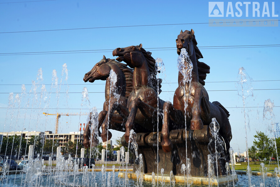 Большой фонтан диаметром 20 метров с бронзовой скульптурой трех бегущих лошадей украшает территорию конно-спортивного комплекса "Битца" в Москве. Лошади выглядят динамично, их гривы и хвосты развиваются, будто они мчатся на полной скорости. Скульптура установлена на постамент, имитирующий волны воды или поток энергии. Вокруг скульптуры бьют многочисленные струи воды с подсветкой, создавая эффект движения и свежести.