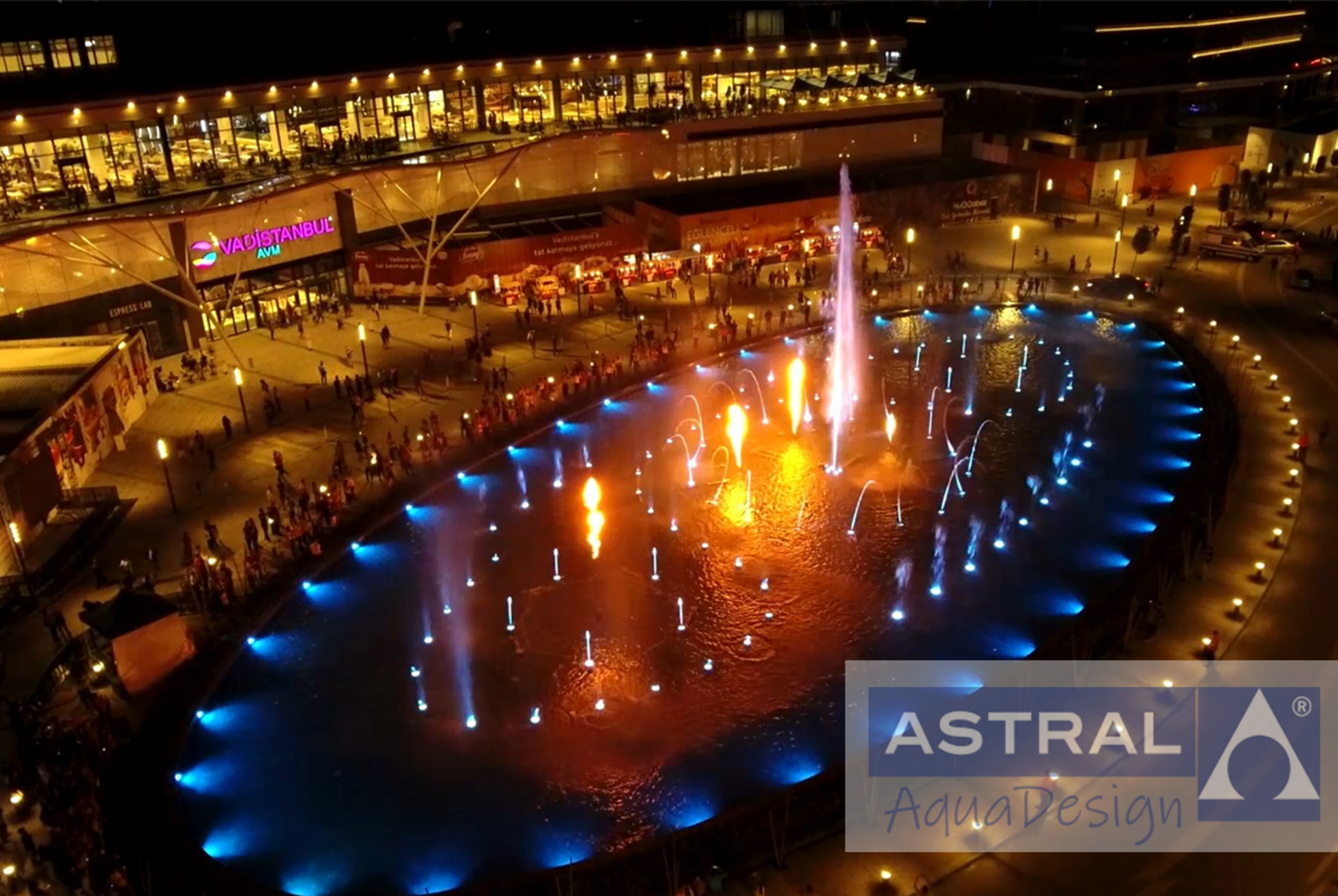 Цветомузыкальный фонтан с огненными насадками напротив торгового центра VADI в Стамбуле Турция