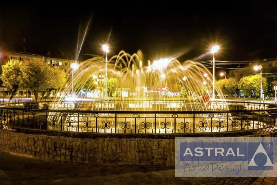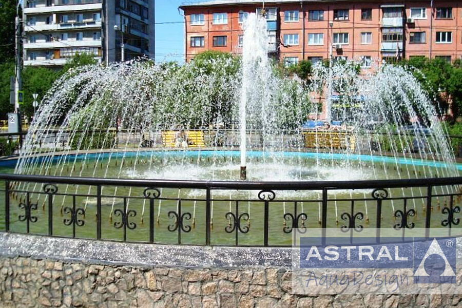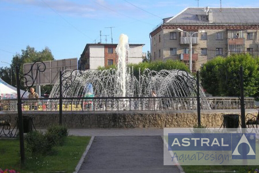 Фонтан с круглой чашей диаметром 12 метров, построенный при непосредственном участии наших сотрудников, венчает Аллею Молодоженов в Тюмени. Водный рисунок создает ряд параболических струй образованных кольцевой насадкой, в центре - пенная струя.