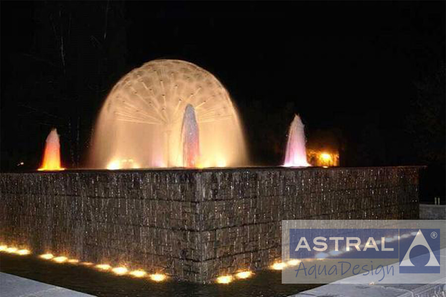Прямоугольную чашу цветодинамического фонтана размером 30х15 метров украшает насадка полусфера, ее дополняют четыре пенные струи. Этот фонтан стал один из многих построенных при непосредственном участии наших сотрудников.