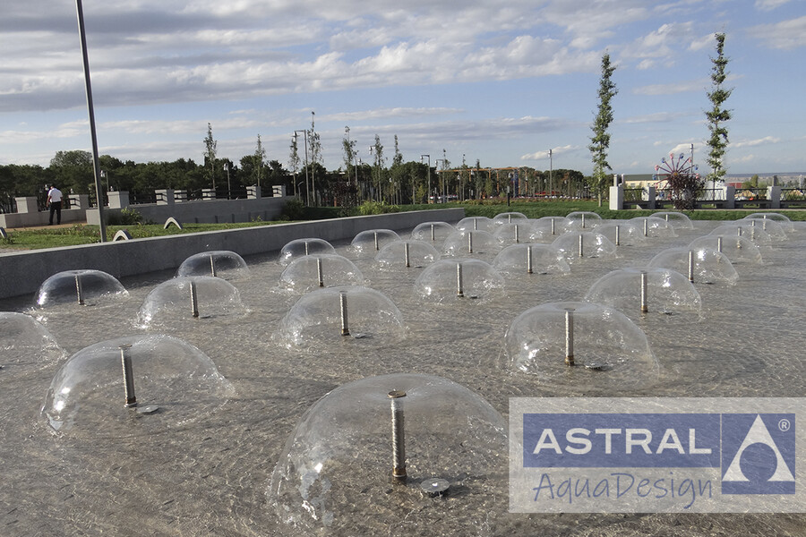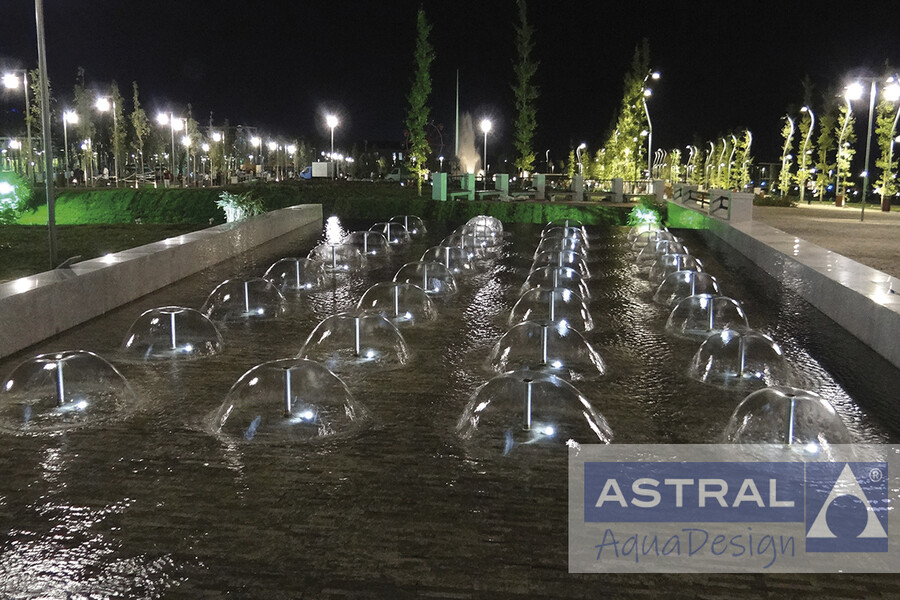 Лаконичный цветодинамический фонтан в парке. Водный рисунок образуют множество пленочных насадок MUSHROOM. Каждая из которых подсвечивается экономичными LED светильниками. Выбор такого оборудования неслучаен. Руководство парка поставило инженерам задачу чтобы шум воды не мешал посетителям парка, поскольку рядом расположен институт и студенты очень любят готовиться к экзаменам под кронами деревьев. Вокруг фонтана обустроена зона отдыха где посетители парка могут насладиться полноценным отдыхом под тихое журчание воды.