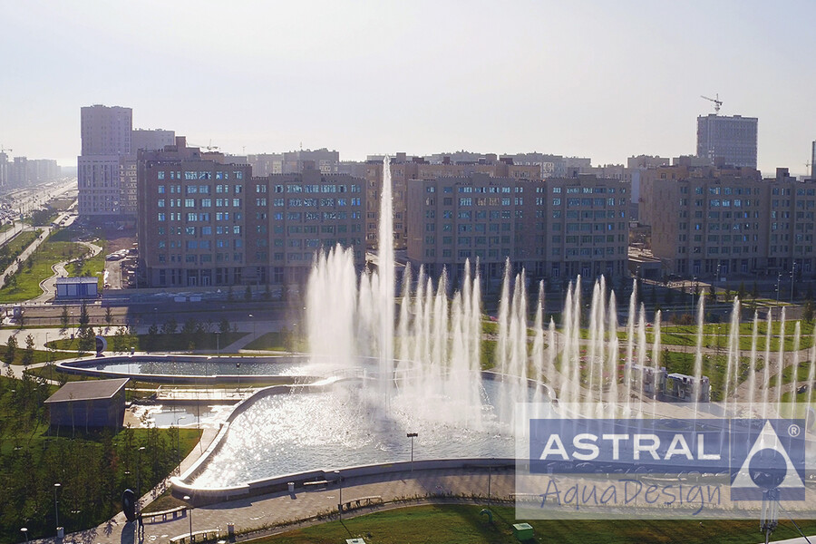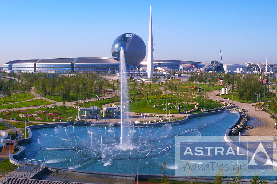 Большой цветодинамический фонтан построен напротив напротив Международного финансового центра в Нур-султане (Астана), Казахстан. Его чаша сложной формы состоит из двух частей соединенных прогулочным мостиком. Центральная струя образована при помощи насадки BIG SPEAR