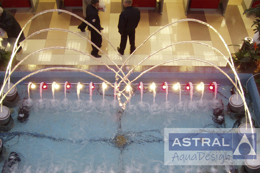 Изюинкой этого фонтана, построенного к открытию ТЦ Европа в Курске являются водные пушки. Они создают гладкие ламинарные струи которые могут образовывать дуги и сталкиваются между собой. А два ряда пенных струй по бокам прямоугольной чаши добавляют динамики композиции.