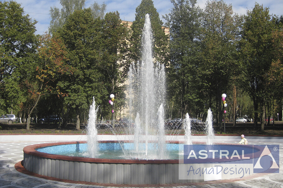 Классический цветомузыкальный фонтан с круглой чашей украсил площадь рядом с ЗАГСом в подмосковном городе Железнодорожный. Пенные струи различного уровня создают основу водного рисунка. Диаметр чаши составляет 10 метров.