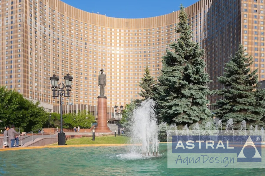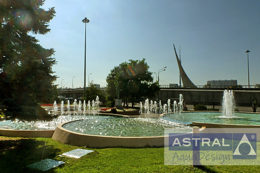 Гостиница "Космос" построенная к летним Олимпийским играм 1980 года, давно является знаковым сооружением столицы. В 2005 году площадь перед ней украсил фонтанный комплекс. Три чаши с переливами имеют диаметр 7, 9 и 10 метров. Пенные струи образованы насадками созданными на европейском оборудовании.