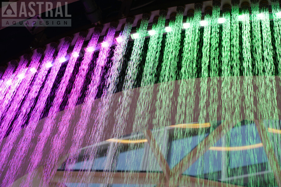Уникальный фонтан "Водный занавес" был открыт в холле бизнес-центра Comcity. Под потолком установлен кольцевой распределитель диаметром 6 метров с 452 форсунками. Благодаря специальной конструкции каждая форсунка создает объемный поток, не требующий большого расхода и соответственно мощных насосов и диаметров труб. Водопад подсвечен линейными светильниками RGBW длиной 25 см в количестве 72 штук с управлением DMX. Подсветка значительно дополняет эффект от водопада, где струи играют разными цветами и яркости подсветки хватает для освещения самой чаши фонтана из полимерного материала. Диаметр переливной чаши фонтана 8,5 метров, высота водопада 4,5 метра.