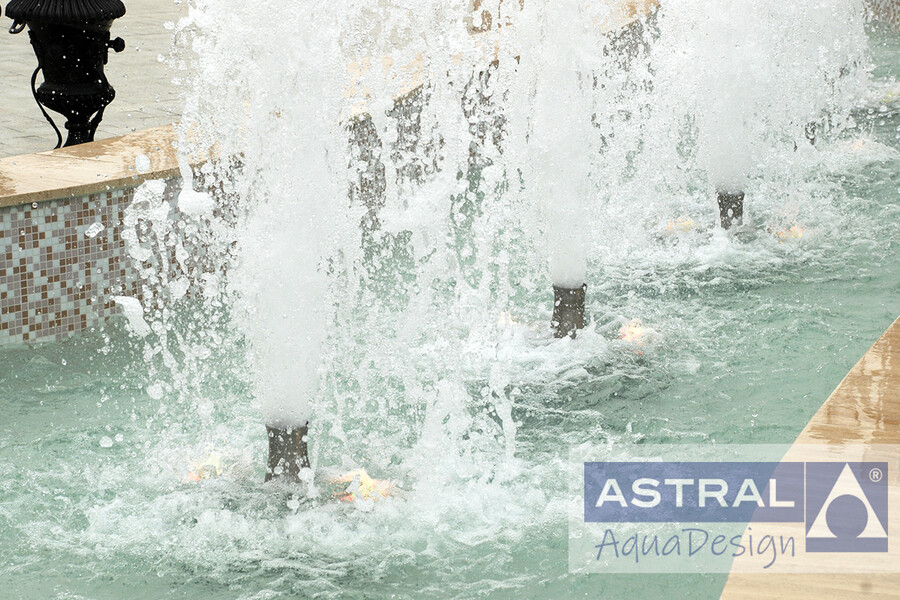 Дно чаши каскада украшено особыми светильниками, которые имеют поверхность имитирующую камень, они абсолютно незаметны днем, однако в темное время суток украшают ее ярким светом.