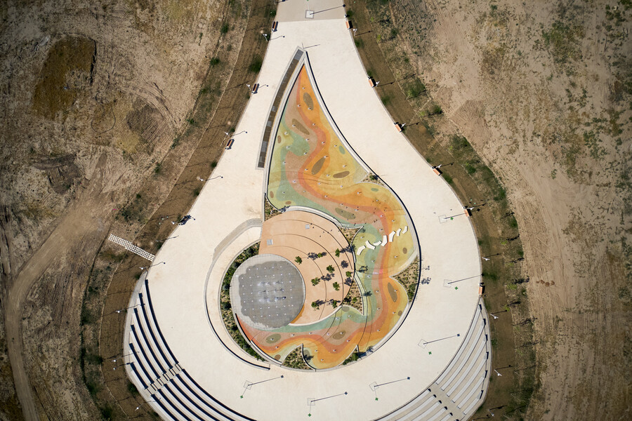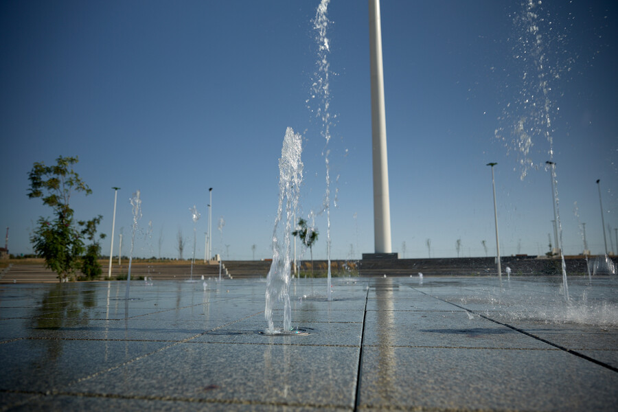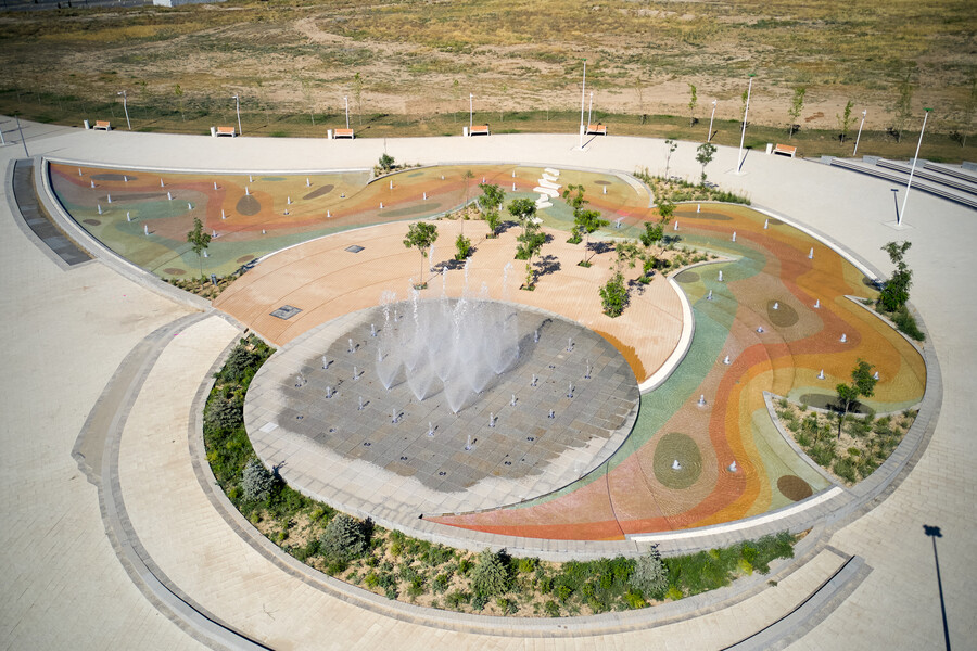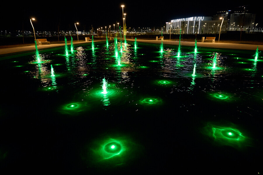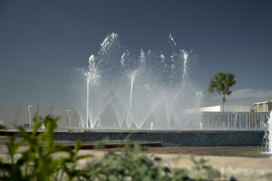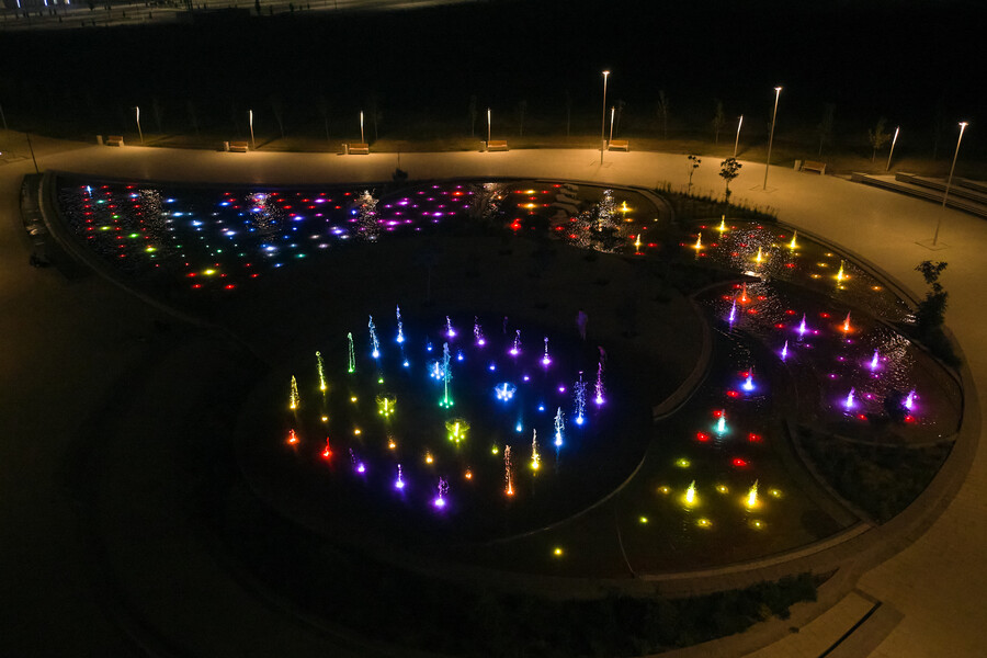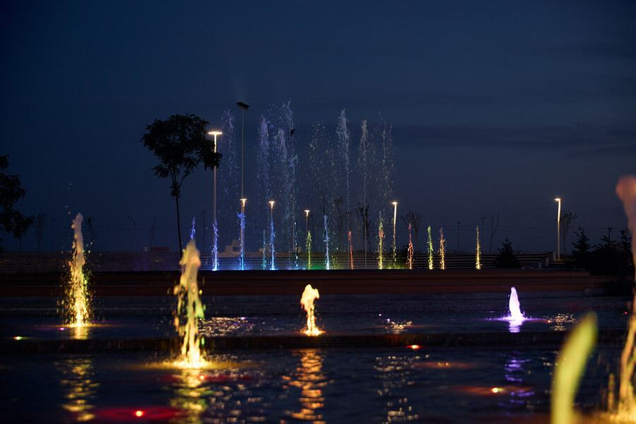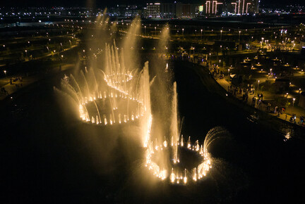 В данном проекте отличным образом сочетаются разнообразные водные эффекты, используемые при строительстве новых современных объектов. Здесь и пешеходный фонтан, и плескательный бассейн, и каскад, и перелив, и зеркальный водоем. Первый запуск произошел в мае 2025 года и полностью введен в эксплуатацию в июле. Комплекс расположен на территории парковой зоны Административно-Делового района "Шымкент Сити" в городе Шымкент (Казахстан).