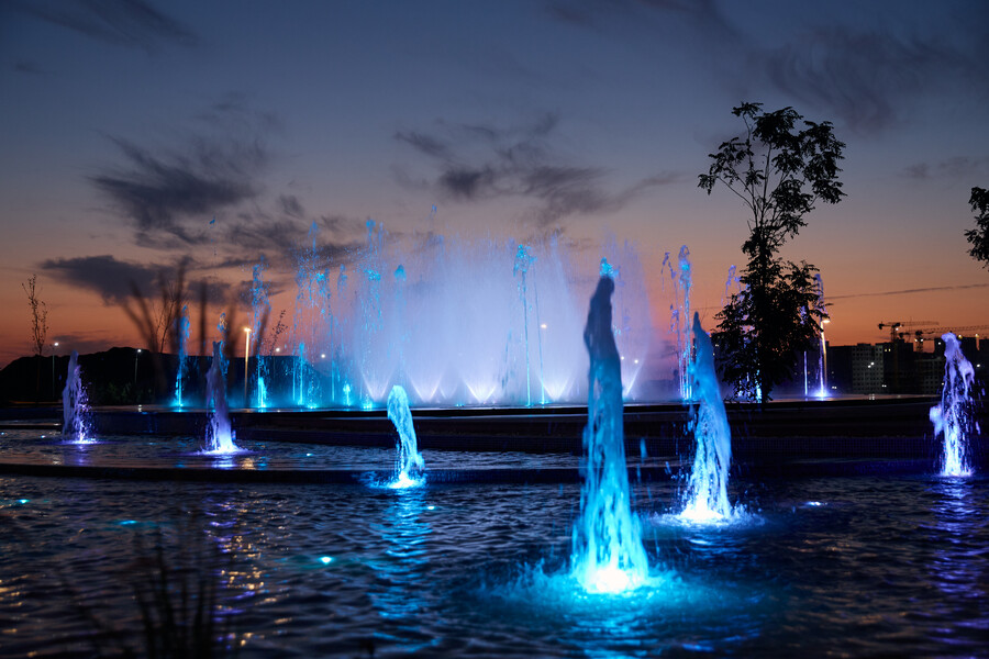 В фонтане применены форсунки с изменяемой формой струи Swap Jet S - 9 шт. и светодиодными светильниками RGBW DMX - 36 шт., туманообразующие форсунки - 128 шт., насадки с пенным эффектом и кольцевые светильники RGBW DMX - 36 шт., моноструйные форсунки и кольцевые светильники RGBW DMX - 50 шт., точечные светильники RGBW DMX - 214 шт. Это новый уровень реализации архитектурного паркового фонтана, построенного при участии нашей компании.