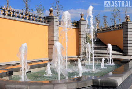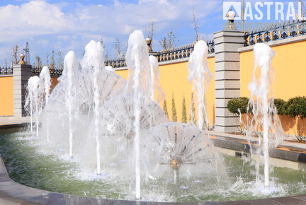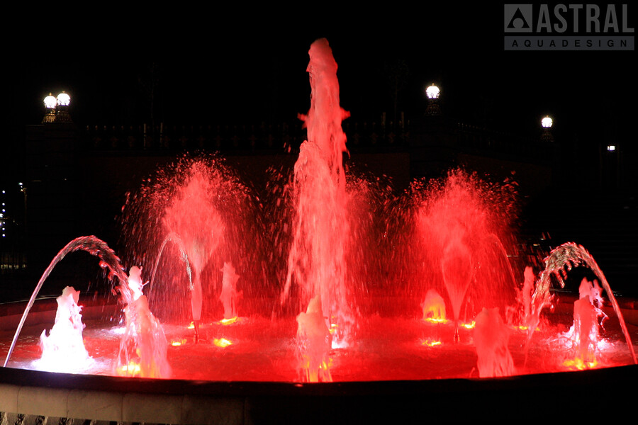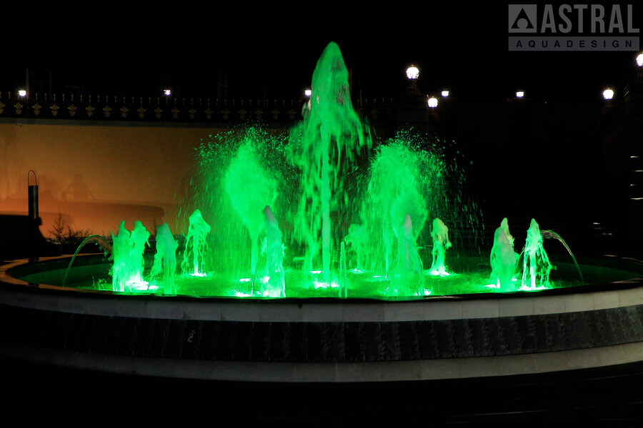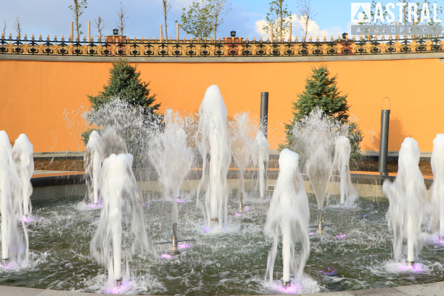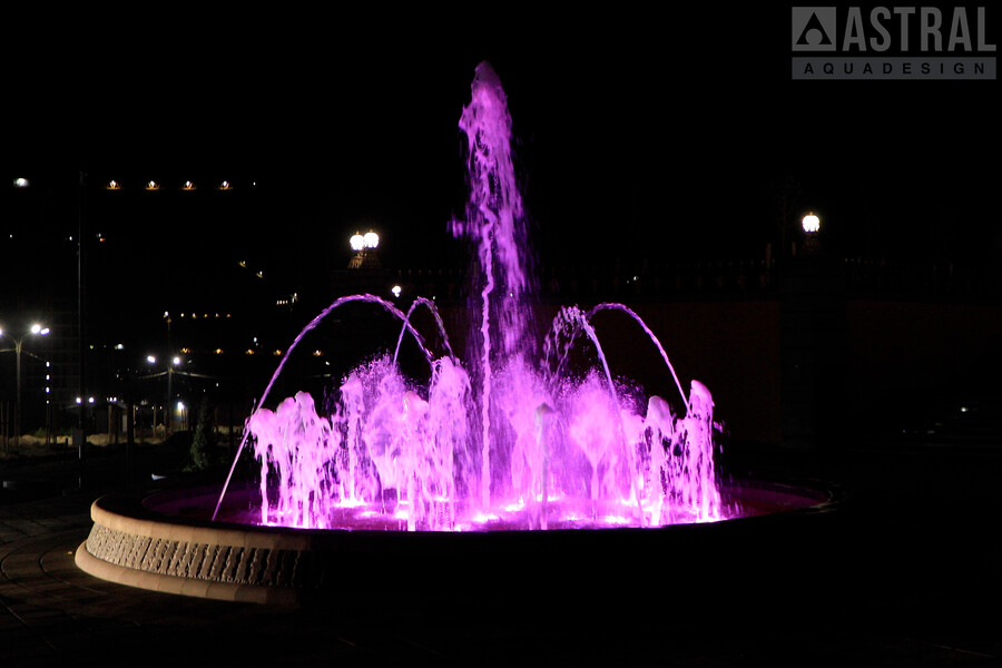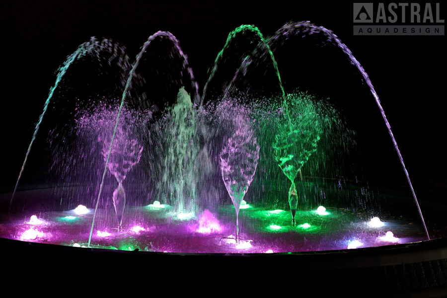 Специалисты нашей компании придумали каждый фонтан (всего их 5), выполнили проектные работы, поставку оборудования, монтаж и пуско-наладку. Первый водный объект представляет собой чашу диаметром 9,0 метров. Фонтан состоит из центральной струи высотой 4,0 метра, арок и ротационных форсунок по 4 шт., а также 12 пенных струй по периметру фонтана высотой 1,0 м. Все струи подсвечиваются современной светодиодной подсветкой RGBW нашего собственного производства.