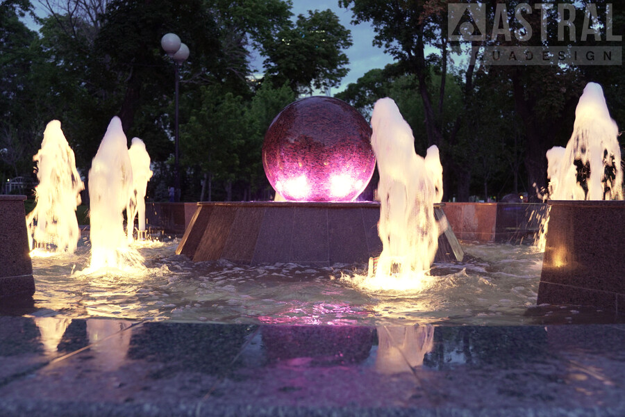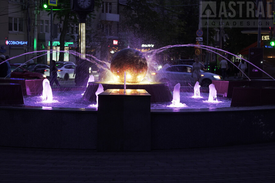 Круглый фонтан "Покровский" диаметром 8,3 метра располагается у входа в Покровский сквер. По периметру чаши расположены 6 тумб. После реконструкции в них были установлены форсунки с механизмами отсечки. Струи параболической формы попадают в гранитный шар в центре фонтана. Шар обрамляют 8 вертикальных пенных форсунок из нержавеющей стали диаметром 50 мм. Фонтан подсвечивается 20 светильниками RGBW мощностью 16 и 32 Вт. "Покровский" реализован совместно с компанией KUPIBAS Group (г. Ростов-на-Дону, www.kupibas.ru).