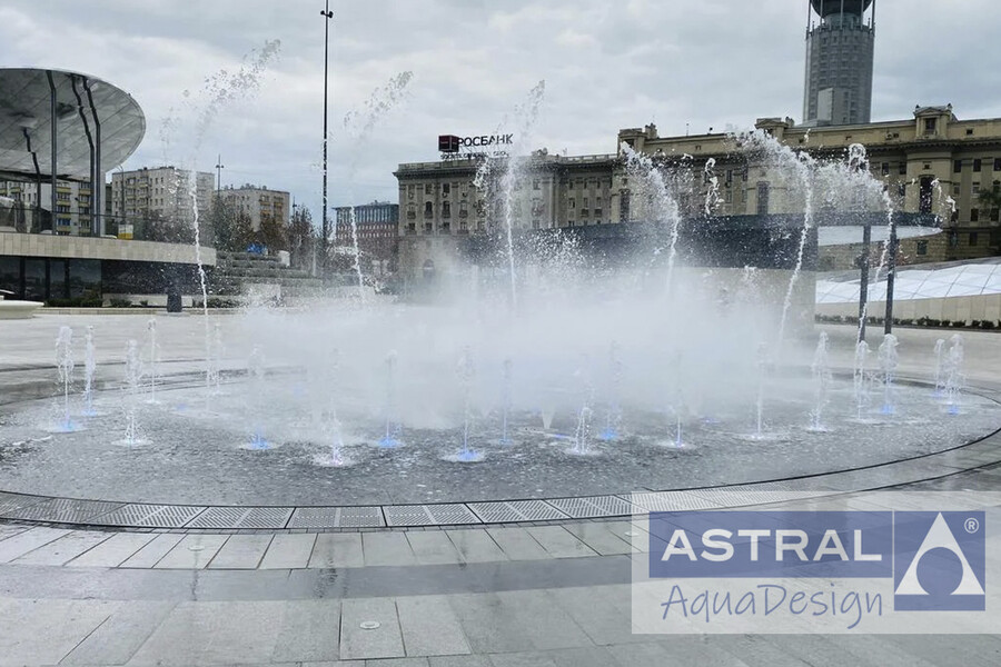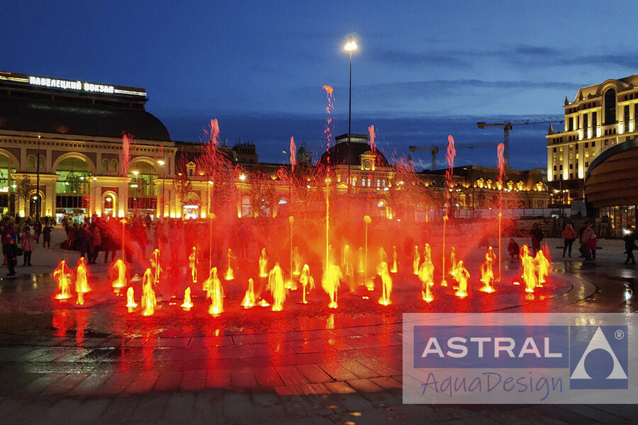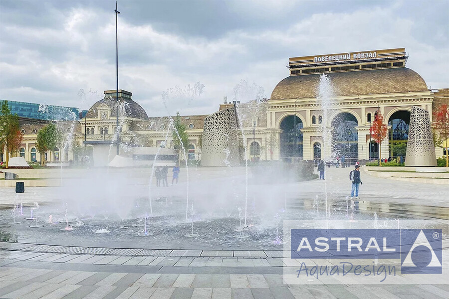 Сухой цветомузыкальный фонтан построен на площади перед Павелецким вокзалом в Москве. Первый запуск состоялся осенью 2021 года. Овальная форма чаши органично перекликается с общей концепцией дизайна нового общественного пространства. По всему периметру установлено несколько видов фонтанных насадок: пенные, танцующие, распыляющие, туманные и т.д. Вечером включается яркая динамическая подсветка струй. Коллектив нашей компании принял участие в проектировании, поставке оборудования, монтаже, пуско-наладке и зимней консервации фонтана. Технология строительства фонтана выполнена с учетом создания на его поверхности катка с искусственным льдом.