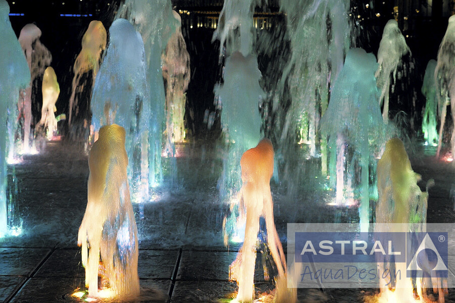 Оба фонтана имеют чашу квадратной формы. Водную композицию в каждом образуют по 72 пенных струи, которые могут достигать 2 метров в высоту. Их создают форсунки FOAMY NOZZLE Ø35 мм. В вечернее время, включается динамическая подсветка. 72 LED светильника RGB+W способны создавать более 16.000.000 цветовых оттенков. Управление подсветкой ведется по протоколу DMX. А общее управление фонтанами осуществляется при помощи системы Syncronorm.
