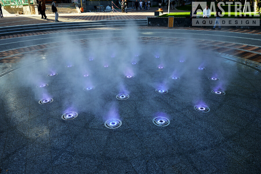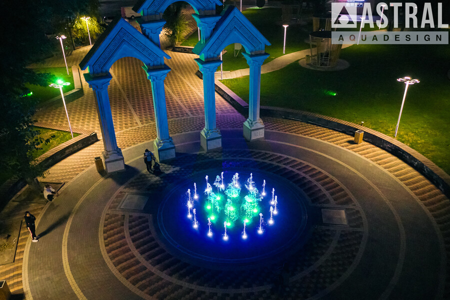 Пешеходный светодинамический фонтан был построен в этом году возле университета ГазКаса в Алматы в рамках благоустройства территории. Фонтан состоит из 25 динамических струй высотой до 2,0 метров. Форсунки управляются 25 быстродействующими подводными клапанами и 1 насосом мощностью 5,5 кВт/380В с частотным регулированием. Водная картина дополнена системой "мягкого" тумана, который превосходно смотрится в ночное время благодаря работе кольцевых светодиодных светильников 20Вт/24В. Общий диаметр фонтана составляет 8,0 метров, до водосборного лотка 7,1 метра.