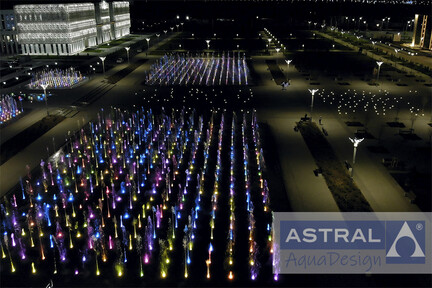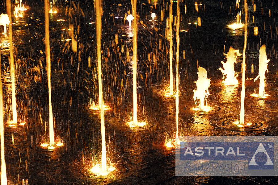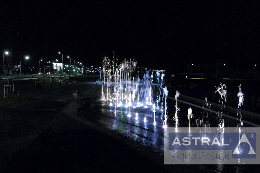 Площадь фонтана более 300 м². Форсунки из нержавеющей стали с пенным эффектом TFE25 1" создают водную композицию из 51 струи, высота которых достигает 4 метров. Управление осуществляется при помощи единой системы Syncronorm. Подсветка организована кольцевыми светильниками RGBW модели Circular 200. Эти светильники, управляются по протоколу DMX, способны создавать 16.000.000 цветовых оттенков.