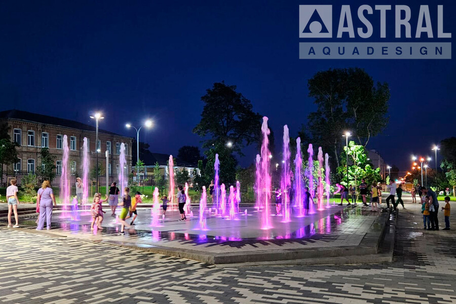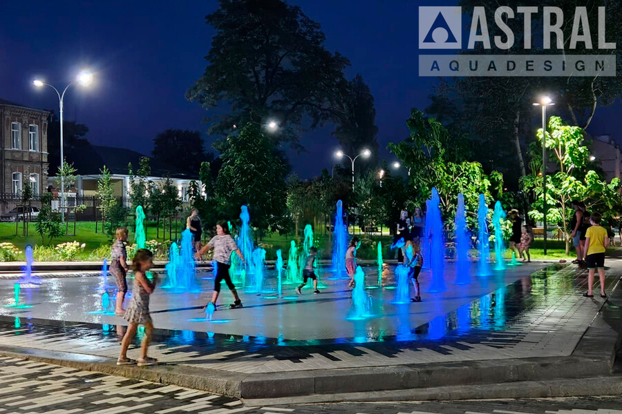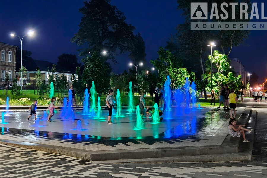 Очередной успешный проект совместно с белгородской компанией Посейдон (www.poseidon31.ru) был реализовали летом 2023 года в городе Новый Оскол. Пешеходный светодинамический фонтан стал украшением входной группы городского парка. Фонтан имеет форму треугольника со сторонами 10х15 метров, накрыт решетчатым настилом из композитного материала, подземное техническое помещение находится рядом с чашей.