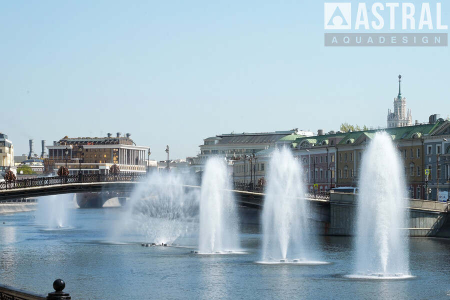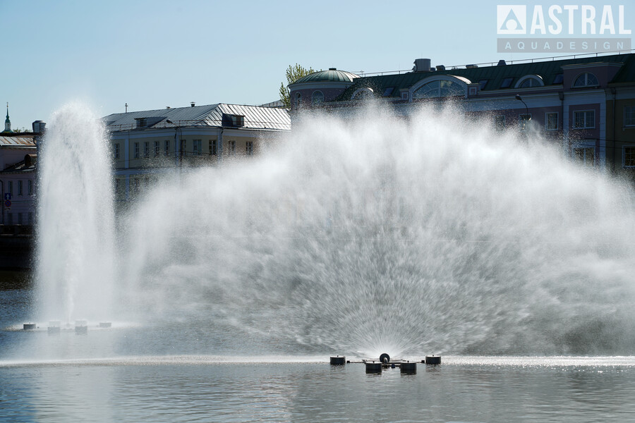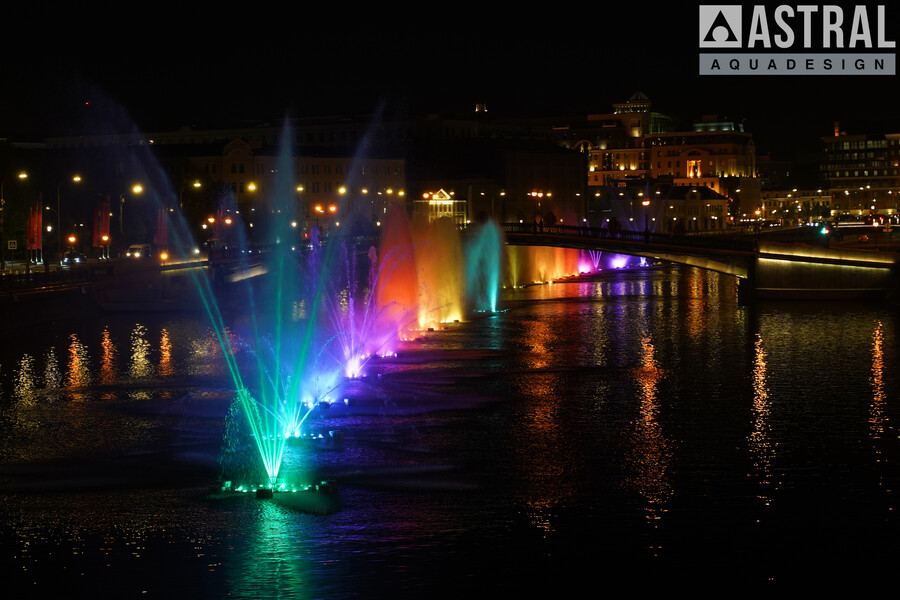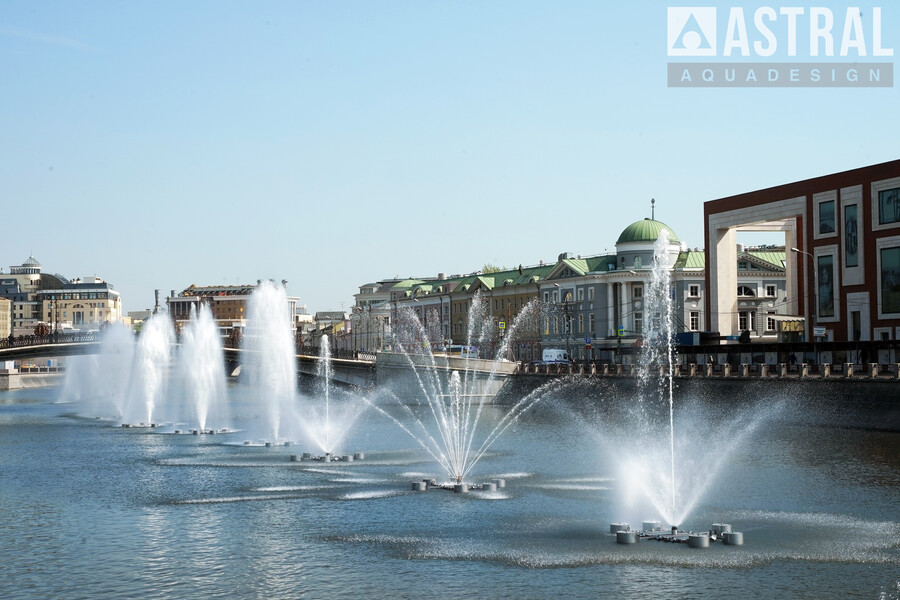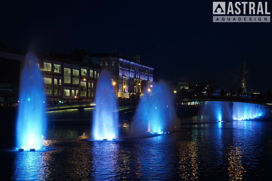 Уникальный фонтанный комплекс из 17 плавающих модулей с подсветкой открыли в Москве в мае этого года. Высота струй составляет от 8 до 14 метров, мощность насосов от 7,5 до 15,0 кВт. Комплекс состоит из разнообразных водных фигур, таких как Букет, Сияние, Гейзер, Скипетр, Лилия и Водный экран. Все фонтаны освещаются в вечернее время светодиодными прожекторами серии RGBA.