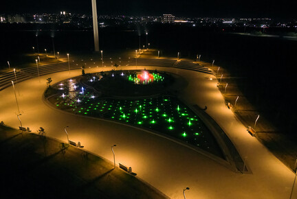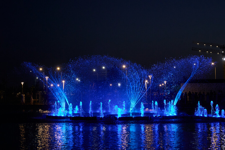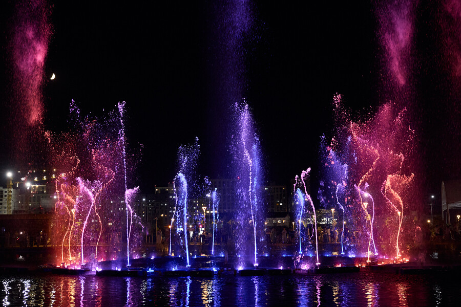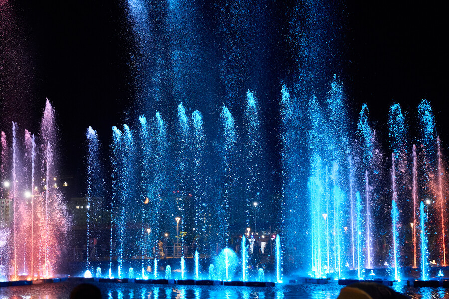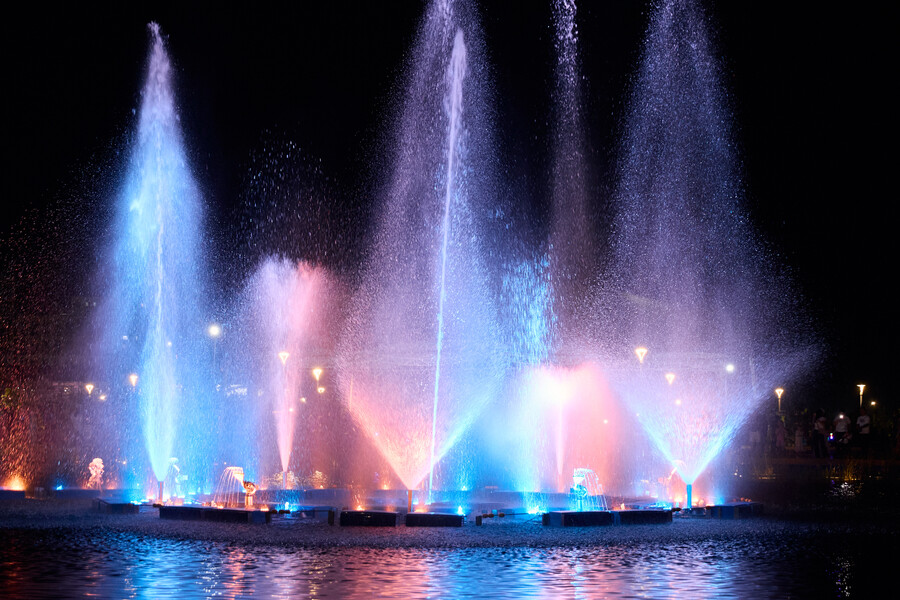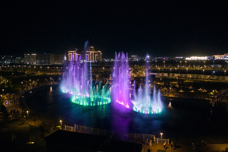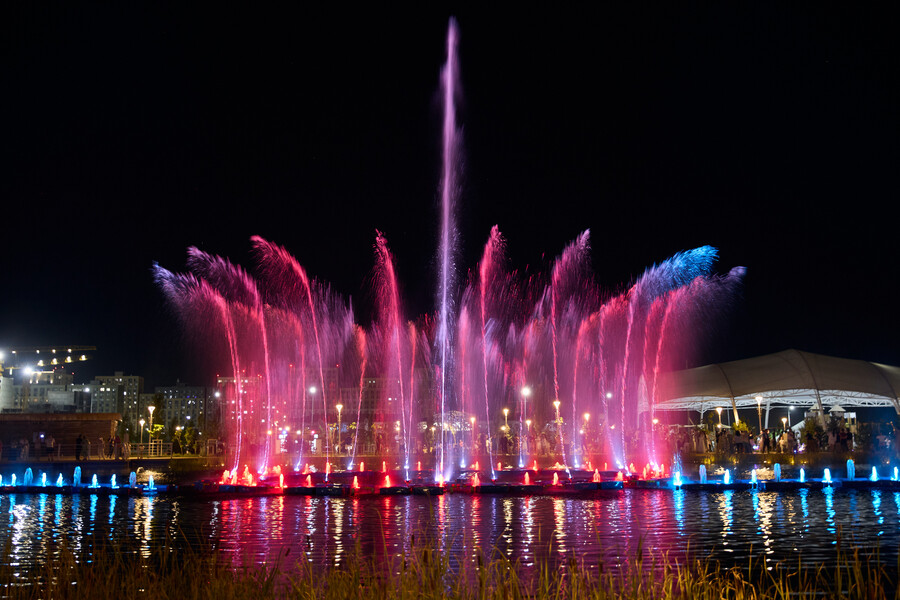 Уникальный плавающий фонтан "Водное шоу" стал украшением новой благоустроенной территории парковой зоны Административно-Делового района "Шымкент Сити" в городе Шымкент (Казахстан). Первый запуск произошел в мае 2025 года и полностью введен в эксплуатацию в июне. В состав плавающей конструкции входят более 150 насосов, 120 форсунок, 30 роботов, 330 подводных светильников. Комплекс оснащен видеопроектором, лазером и акустической системой.