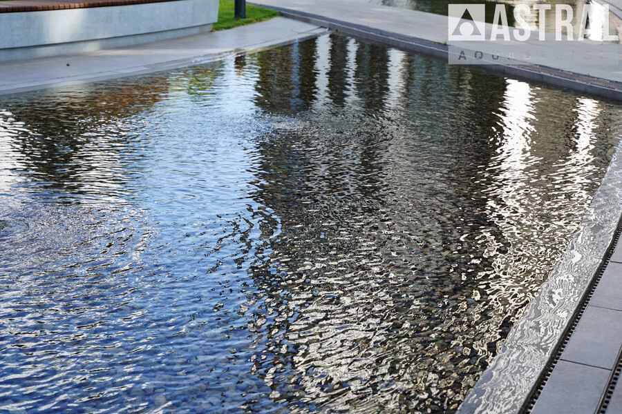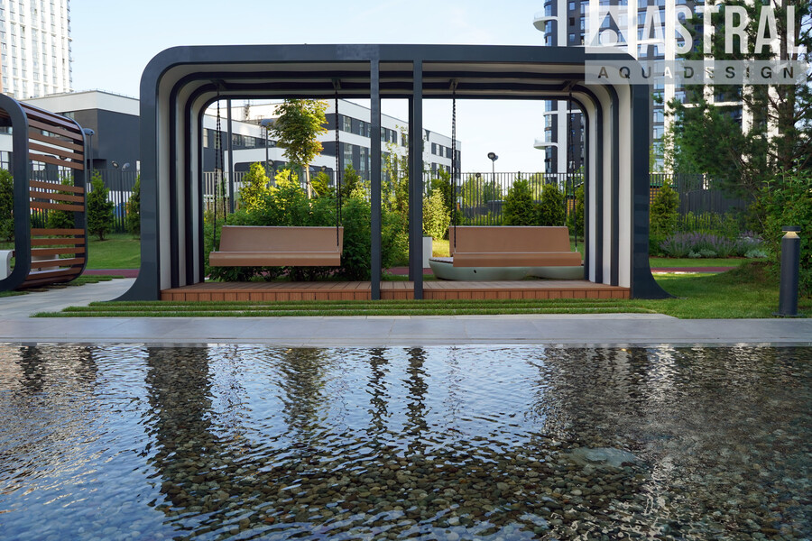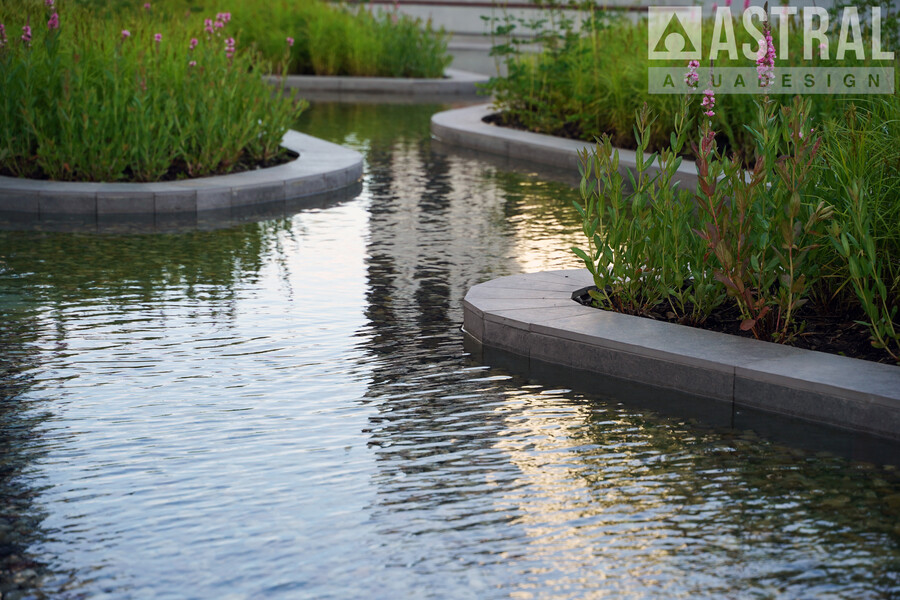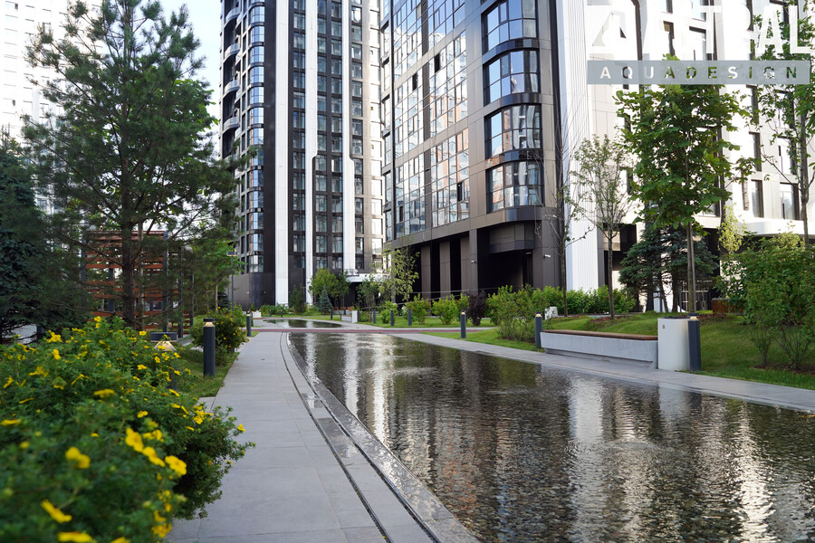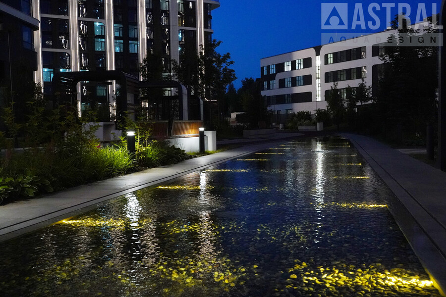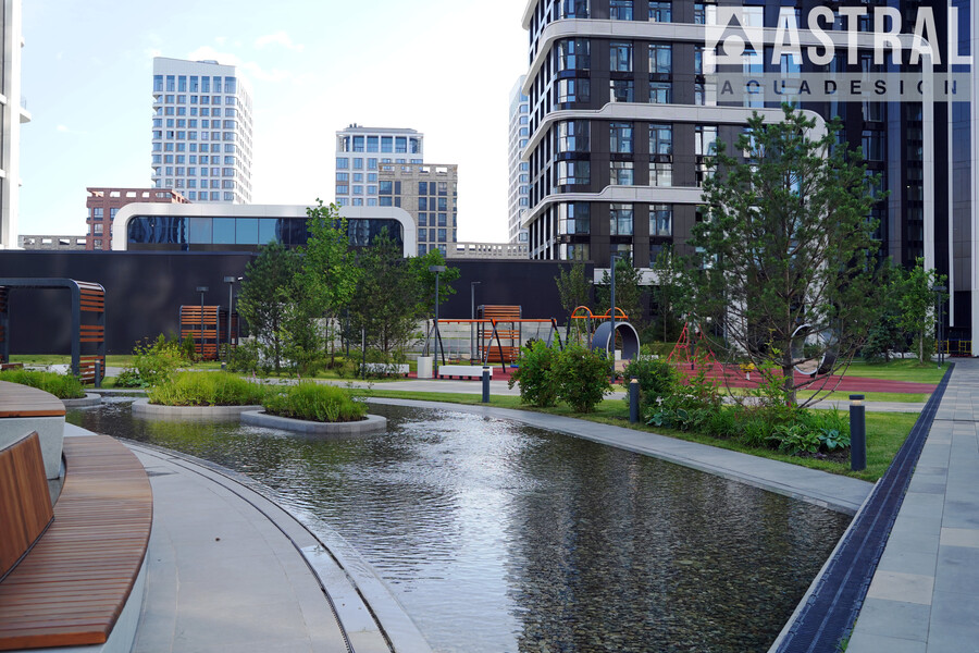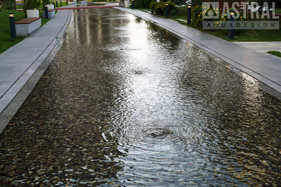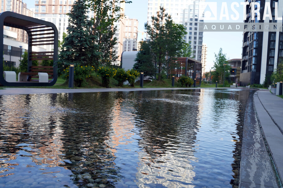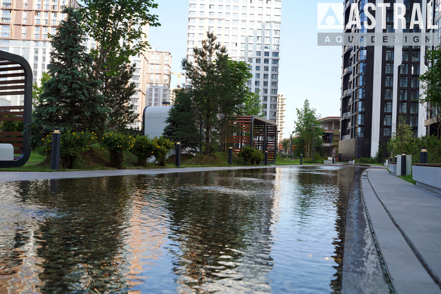 Водная гладь с эффектом реки была полностью разработана, спроектирована и смонтирована специалистами нашей компании. Река расположена в современно жилом комплексе "Остров-2" на западе Москвы. Русло реки в ЖК повторяет русло реки Москва, которая расположена неподалеку.