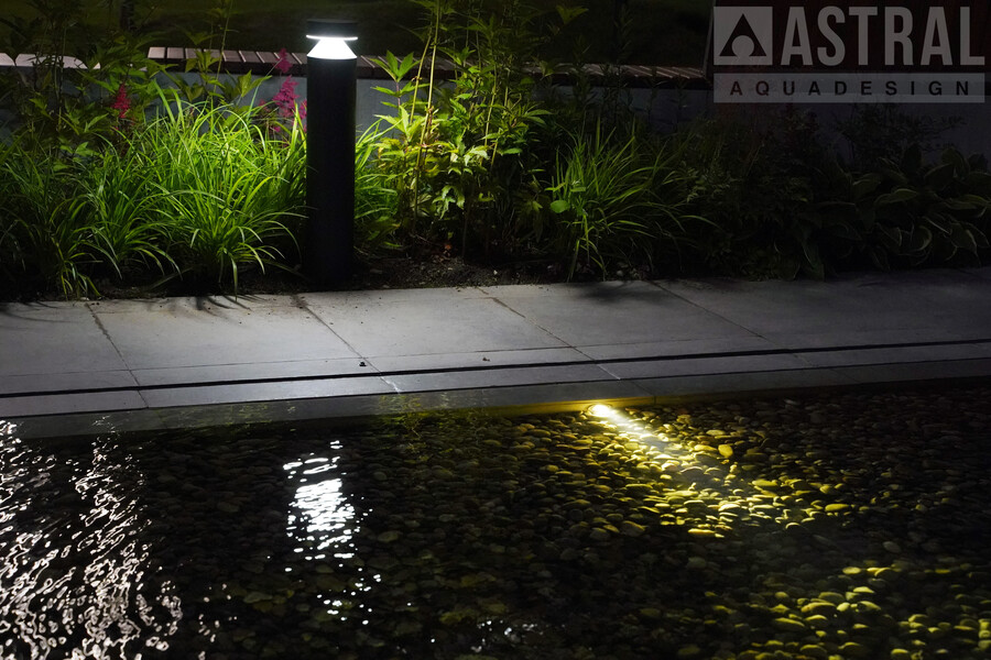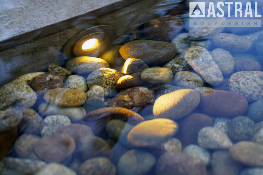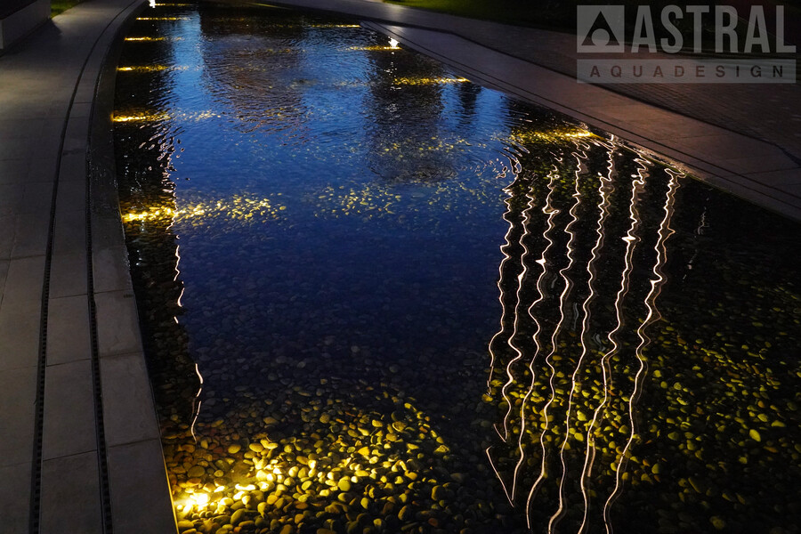 Основные технические данные водной глади: площадь зеркала воды 1000 м2, длина реки 300 м, общий объем воды в русле 170 м3, установлены 200 точечных встраиваемых светильников мощностью 3Вт каждый модели Astral Micro, оборот воды обеспечивают 4 насоса по 12,5 кВт/380В, применены 80 специальных форсунок направленного действия для имитации течения реки.
