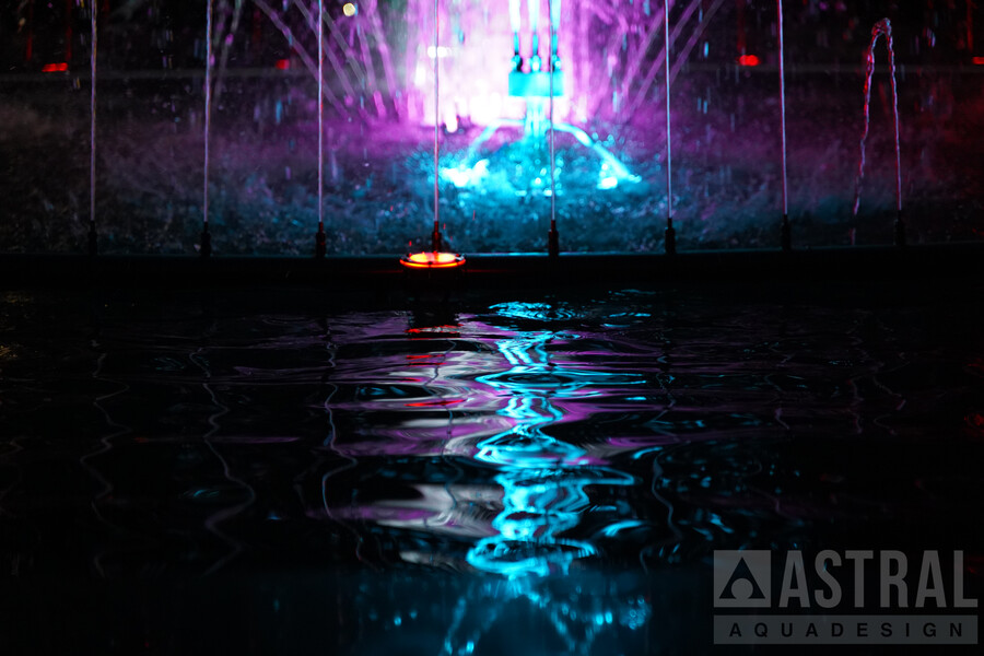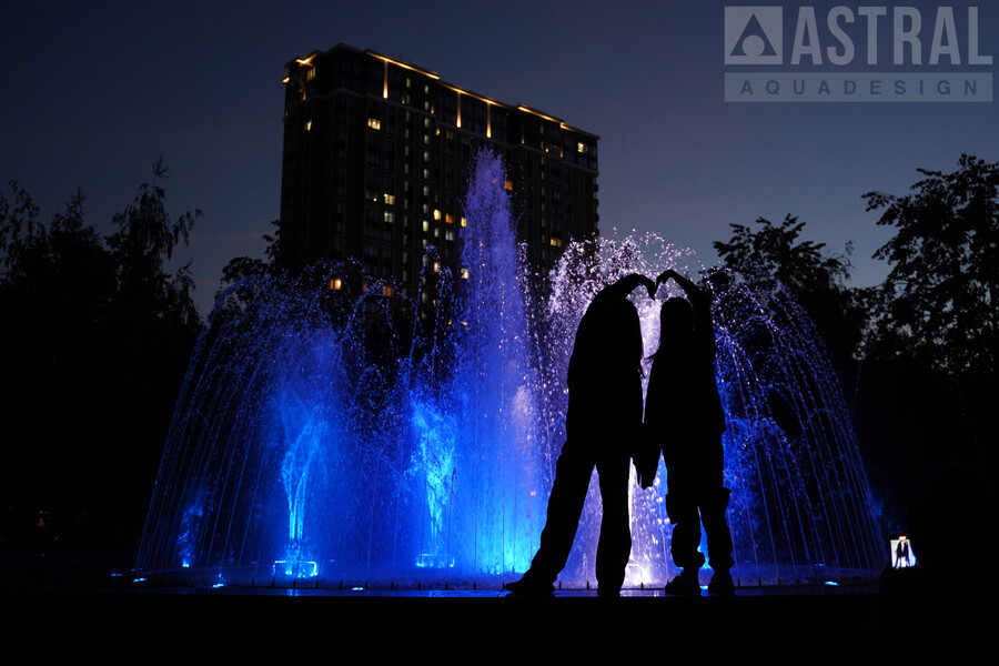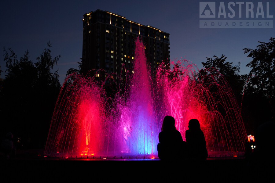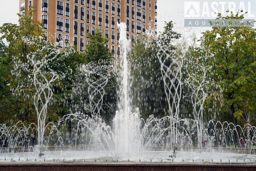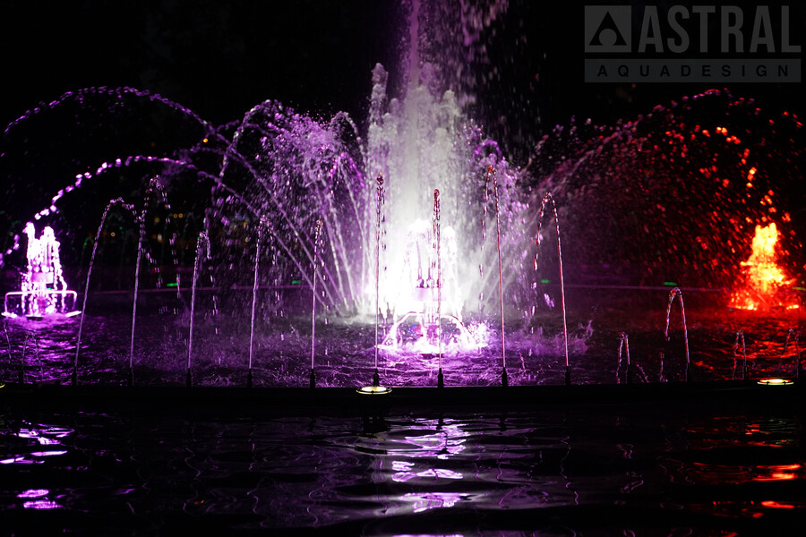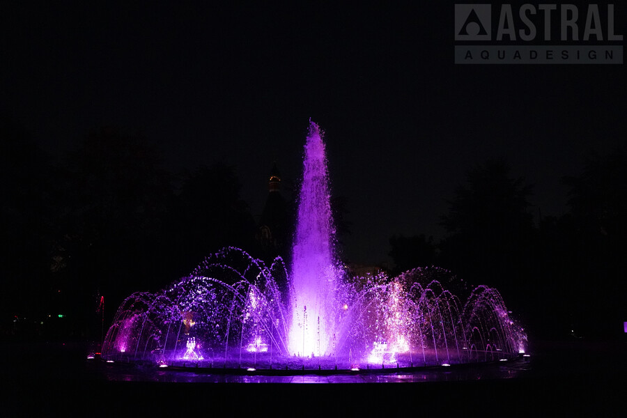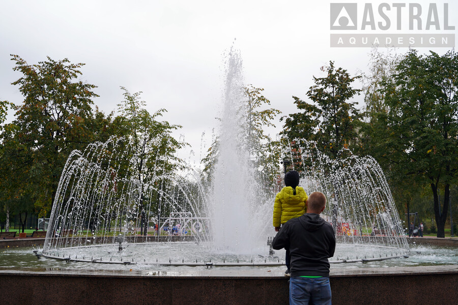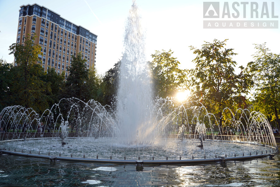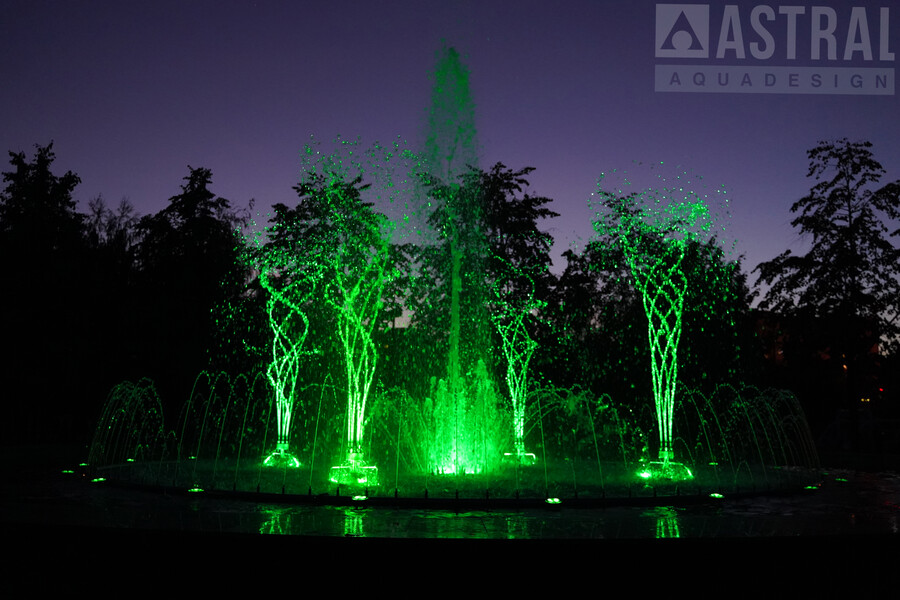 Фонтан диаметром 15 м имеет 4 водных контура, создавая меняющуюся по заданной программе картину. В центре фонтана раскрывается пышный цветок из пенных струй высотой до 5 м. Вокруг установлены вращающиеся насадки, каждая выбрасывает 6 струй диаметром 12 мм, закручивающихся спиралью на высоту до 4 м. По периметру фонтана расположено кольцо диаметром 8,6 м из параболических струй, направленных к центру фонтана.