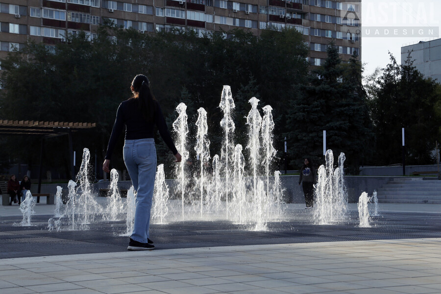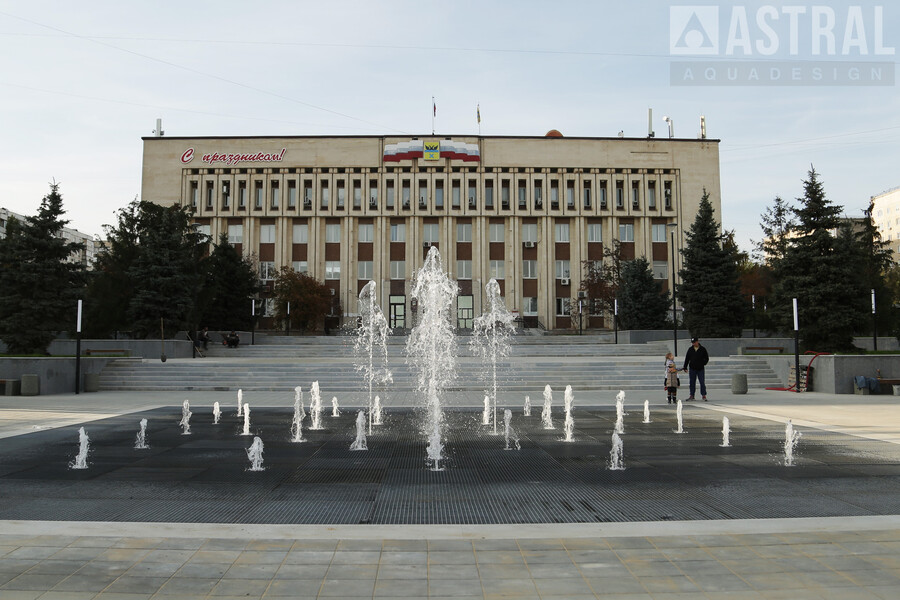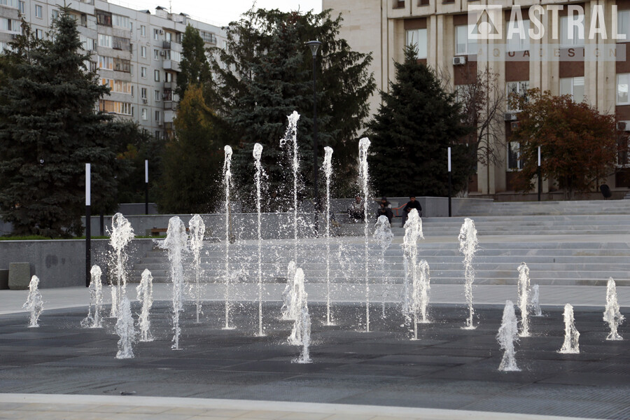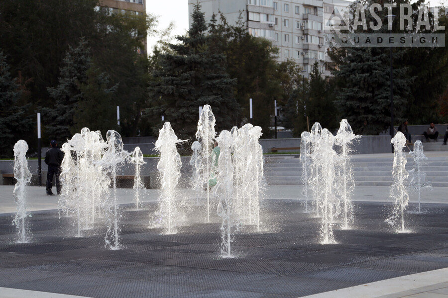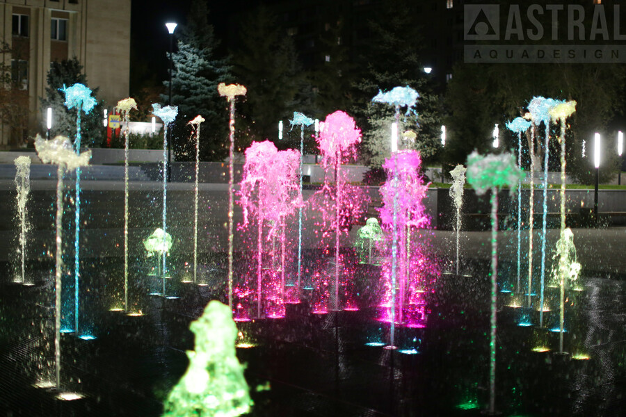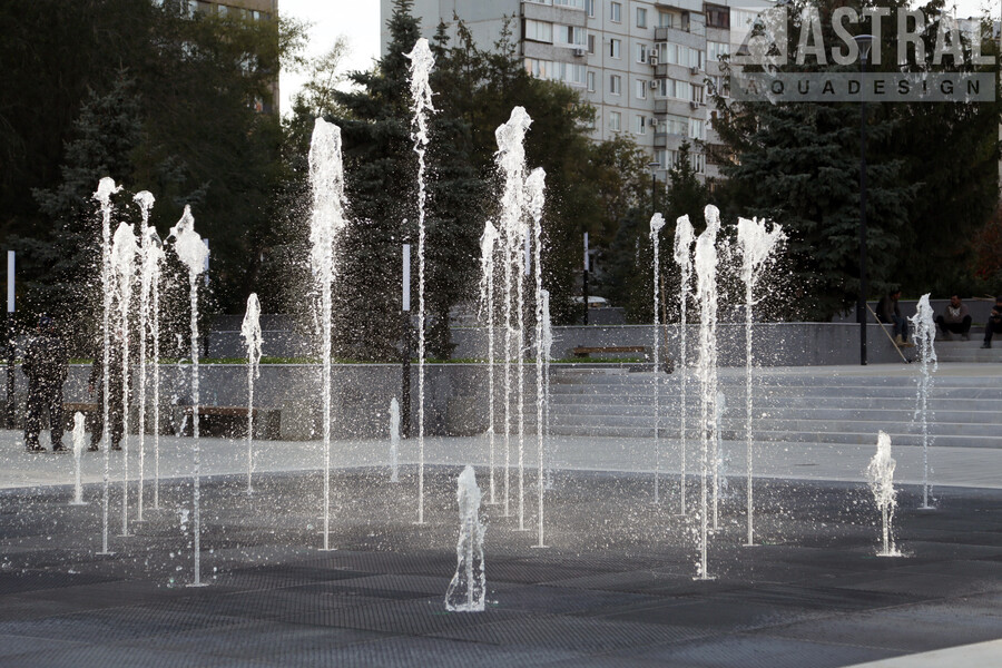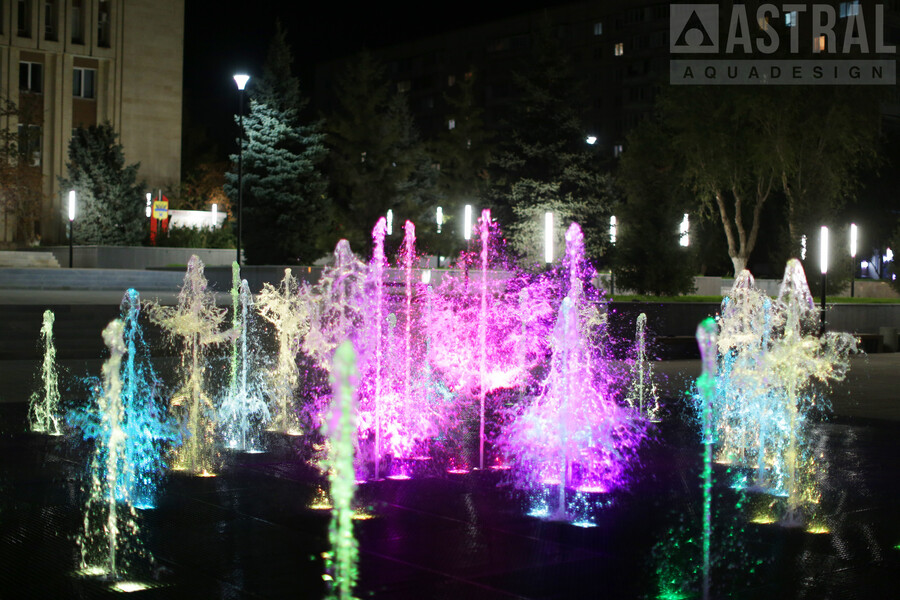 Специалисты нашей компании совместно с фирмой ООО "Новый век" произвели реконструкцию фонтана напротив здания Администрации Южного округа Оренбурга. Сначала была произведена оценка состояния старого фонтана, далее разработка проектной документации, после этого поставка материалов и пуско-наладка. Все это было выполнено в кротчайшие сроки одновременно с работой подрядной организации. В техническом помещении фонтана смонтированы насосы, фильтрация, шкаф управления, акустическое оборудование и все другое необходимое для полноценной работы фонтана. Водная картина состоит из 5 контуров, а в общей сложности из 33 струй достигающих высоту 5,0 метров. Струи подсвечиваются RGBW светильниками 32Вт в количестве 66 шт. Фонтан покрыт металлическими решетками по площади 13х14 метров, из отверстий которых вылетают струи воды. Фонтан работает не только в нескольких динамических режимах, но и в музыкальном от любой мелодии.
