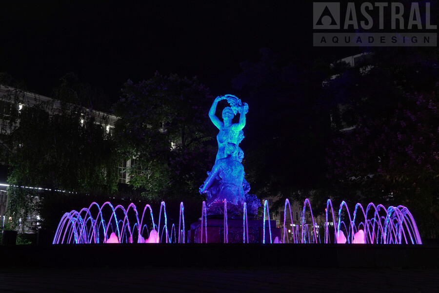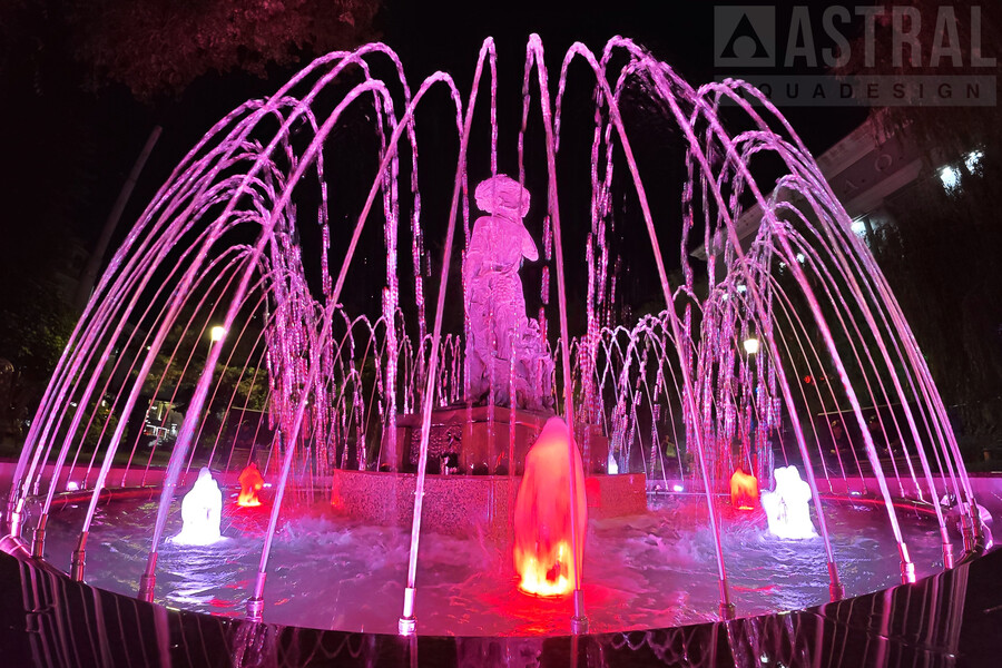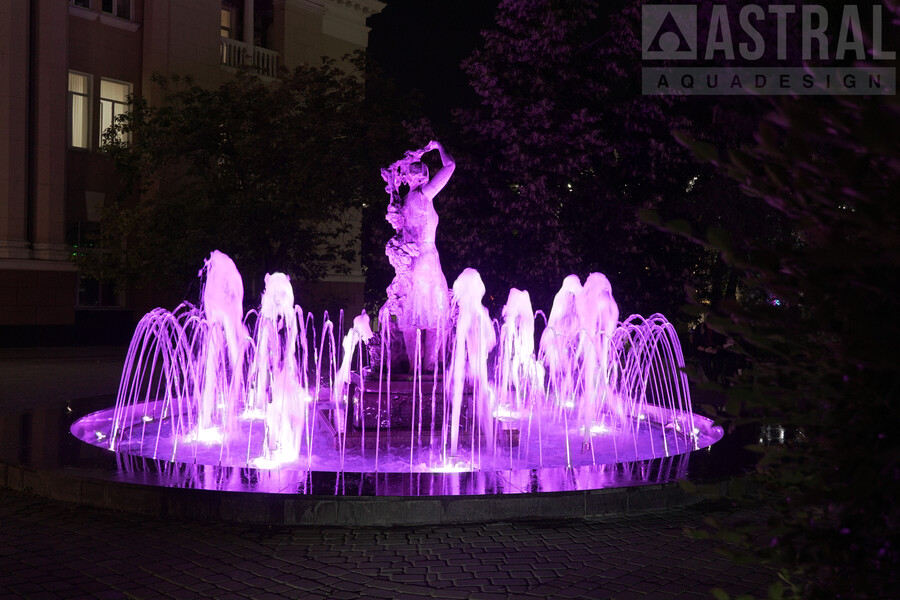 Фонтан подсвечивают 23 светильника RGBW мощностью 16 и 32 Вт. Фонтан "Ротонда" реализован совместно с компанией KUPIBAS Group (г. Ростов-на-Дону, www.kupibas.ru).