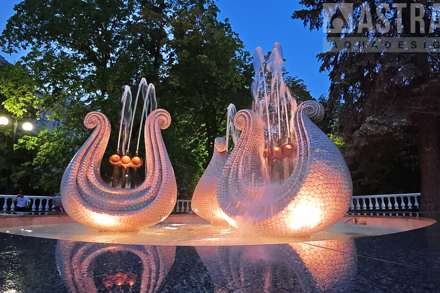 В круглой чаше диаметром 7,5 метра располагаются три скульптуры, покрытые мозаикой, своими формами напоминающие древнегреческий музыкальный инструмент - лиру. Водные струи имитируют струны лиры, где максимальная высота струй достигает 1,5 м. Композиция подсвечивается светодиодными светильниками с теплым белым свечением. Фонтан "Лира" стал еще одним совместным проектом с компанией KUPIBAS Group (г. Ростов-на-Дону, www.kupibas.ru).