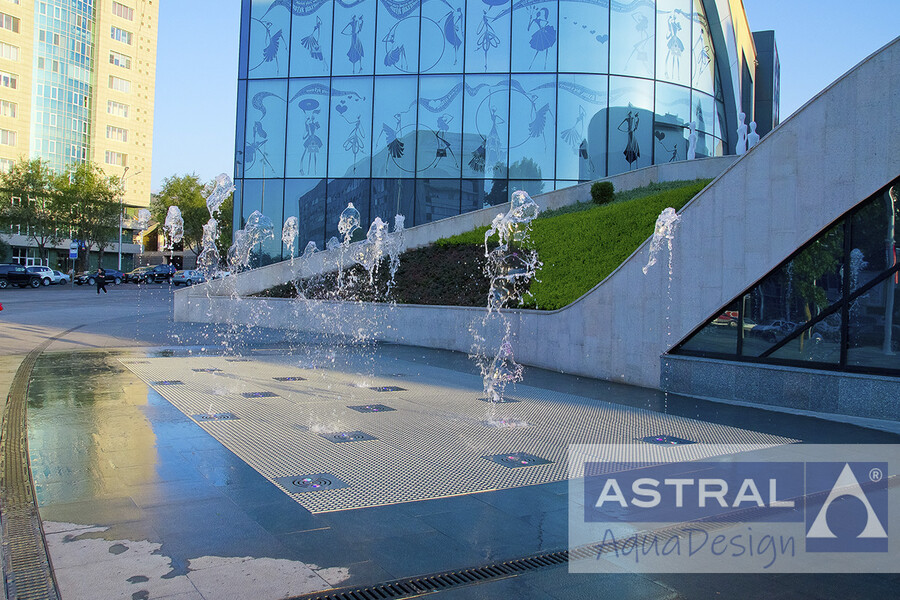 Напротив ТЦ Достык Плаза появился современный пешеходный цветодинамический фонтан. Он эффектно дополнил территорию перед главным входом.