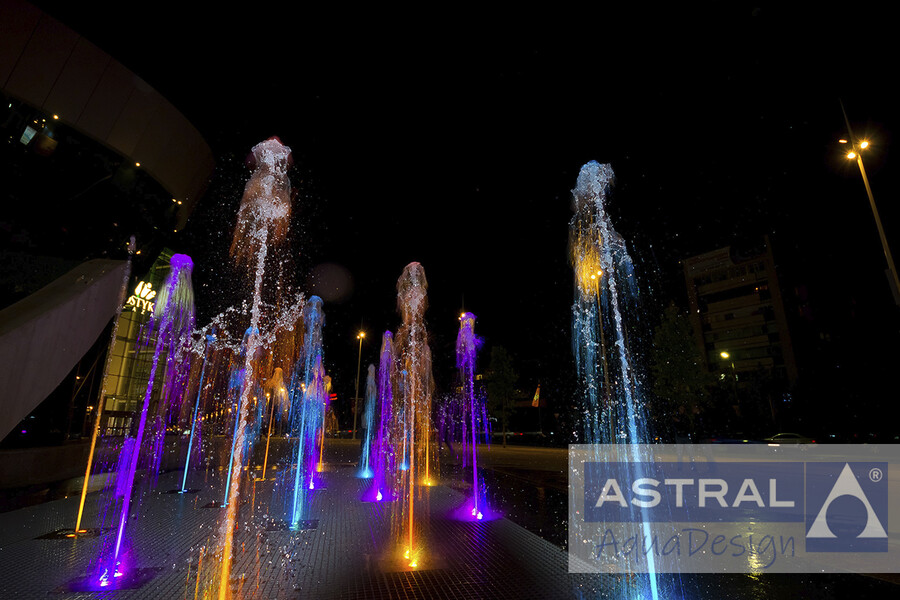 Несколько пешеходных модулей оборудованных экономичными LED светильниками создают потрясающую водную картину. Теперь это любимое место отдыха посетителей ТЦ.