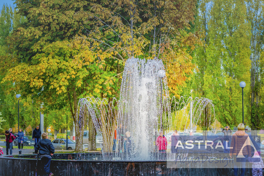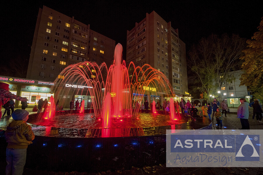 Цветодинамический фонтан с круглой чашей был построен при участии наших сотрудников в Балаково (Саратовской области). Диаметр чаши - 6 метров. Водную композицию создают две кольцевые насадки и одна пенная. Высота центральной пенной струи может достигать 5 метров. Вечером включается подсветка созданная мощными но экономичными RGB светильниками.