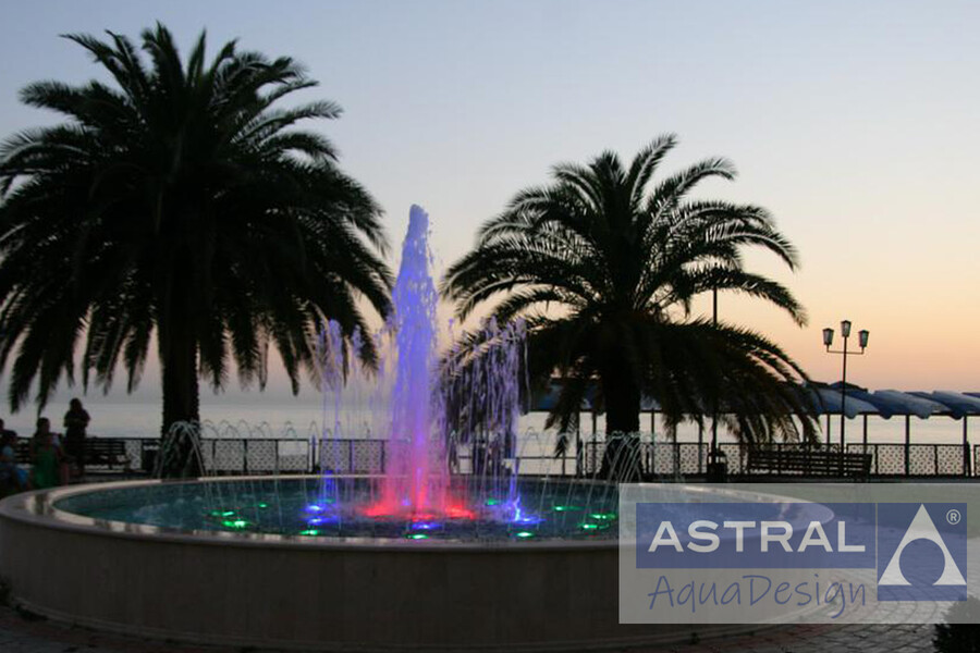 Цветодинамический фонтан построили на побережье Черного моря радом с многочисленными кафе. Пенные насадки разного уровня создают основу композиции, максимальная высота может достигать 4,5 метров. В дополнение к ним установлено фонтанное кольцо диаметром 3,6 метра. 24 подводных светильника создают динамическую подсветку в вечернее время.