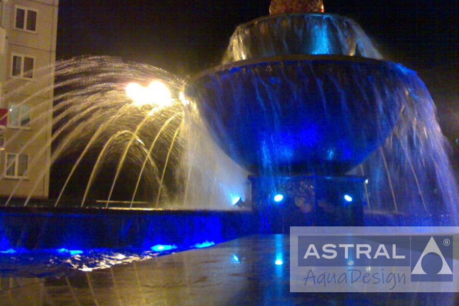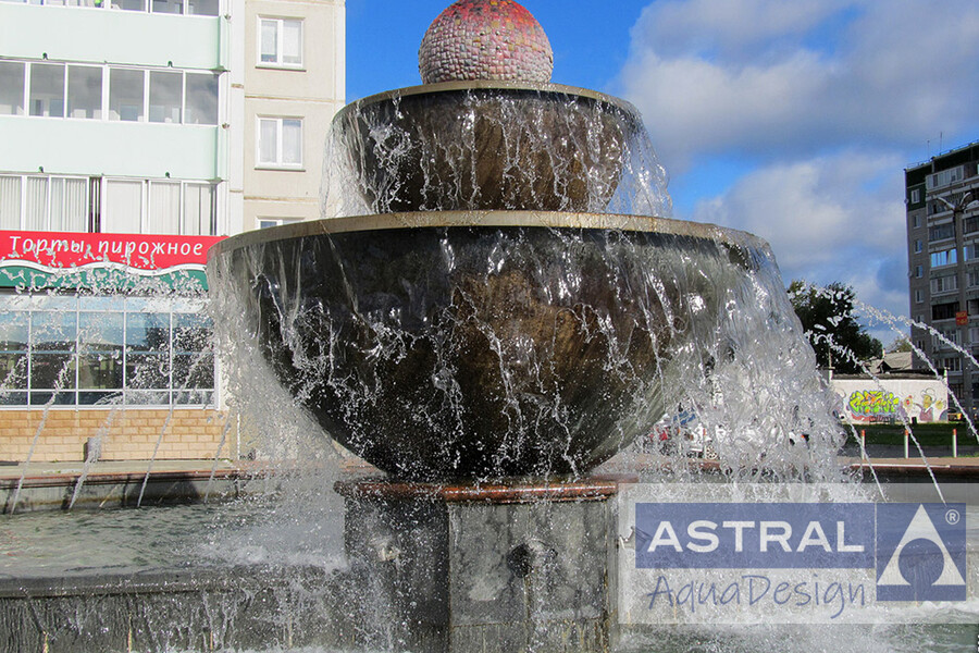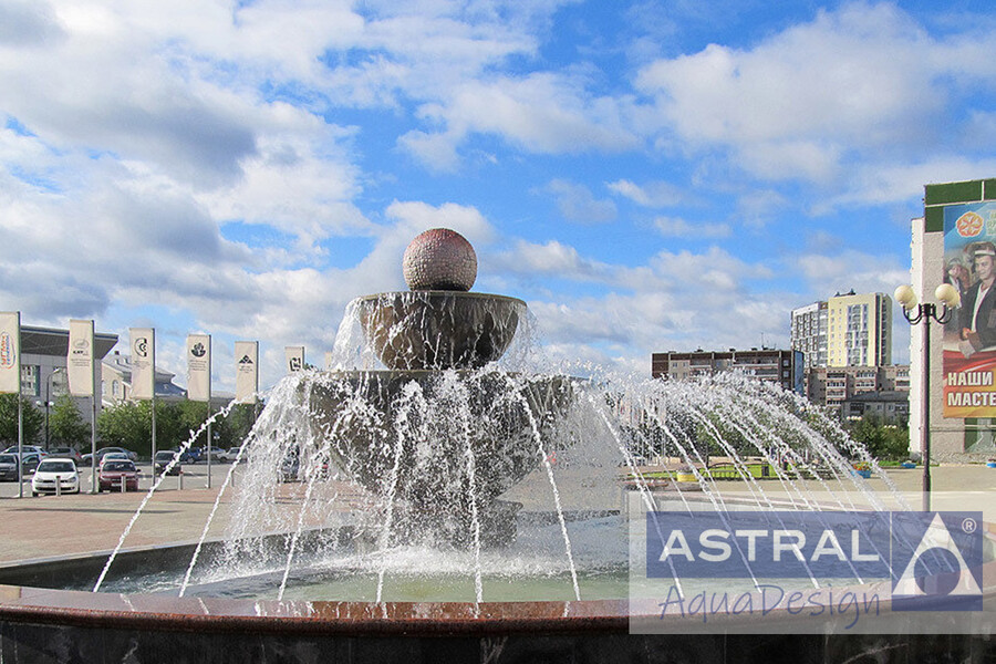 Скульптурный цветодинамический фонтан был построен при непосредственном участии наших сотрудников в городе Верхняя Пышма в Свердловской области. Ряд дугообразных струй сходится к центральной части - малой чаше с переливами. Главная чаша с низкими бортами имеет диаметр 5 метров.
