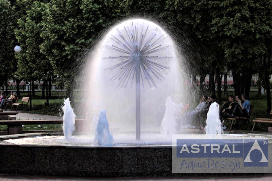 Цветодинамический фонтан со сферической насадкой установлен на площади города Жодино (Беларусь). Вокруг нее расположены несколько водных струй. Множество RGB светильников обеспечивают подсветку фонтана в вечернее время.