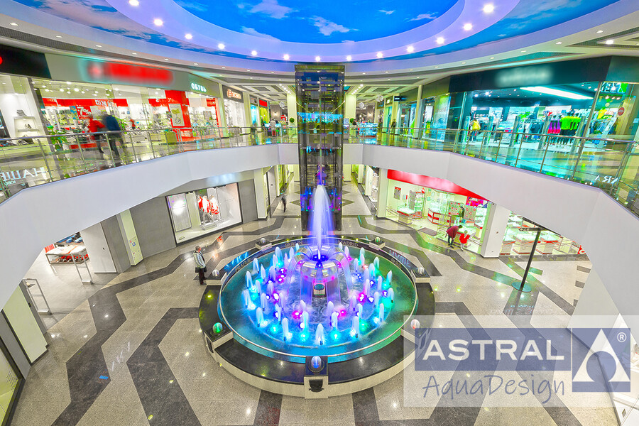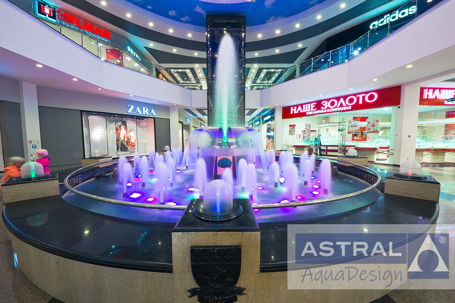 Водный рисунок создают пенные струи и изливы. Высота центральной струи может достигать 6 метров. С помощью изливов из нержавеющей стали образована центральная композиция. Несколько струй расположены прямо на бортах, каждый их них укрыт куполом из оргстекла. Подсветка создана таким образом чтобы быть яркой и заметной в условиях ярких ламп торгового центра.
