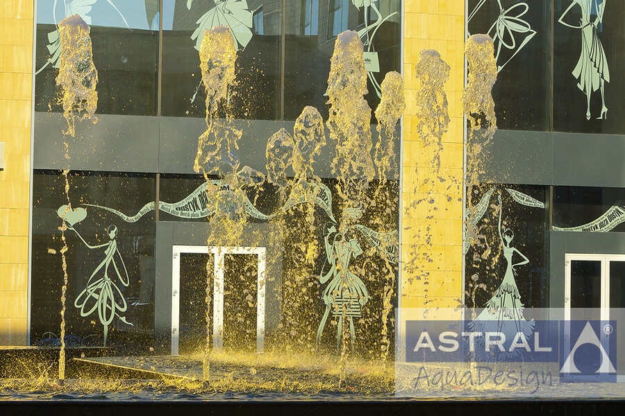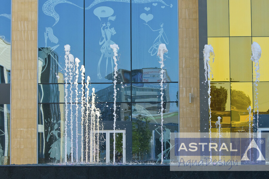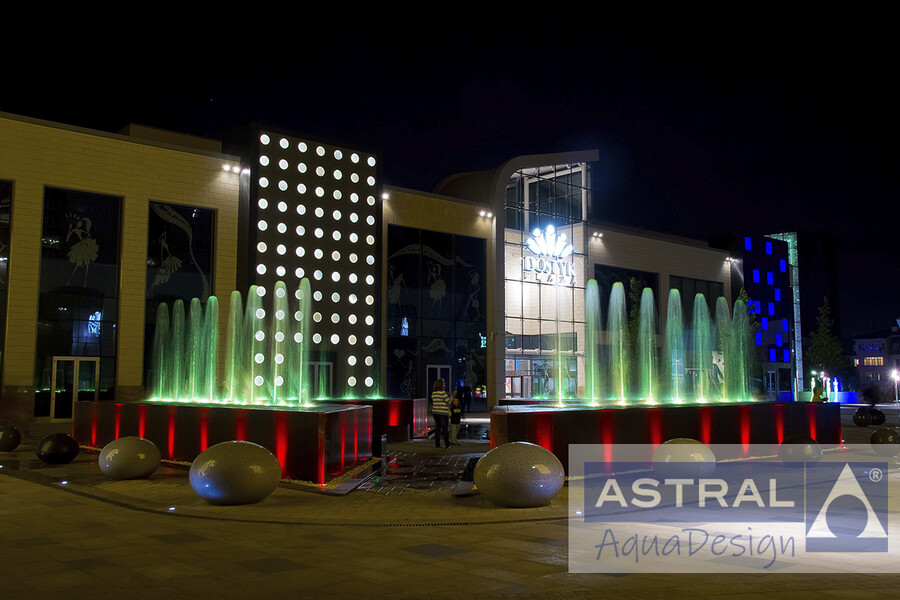 Цветомузыкальный фонтан выполненный в ультрасовременном дизайне построен перед торговым центром Достык Плаза в Алматы. Он дополнил пешеходный фонтан, расположенный на нижнем уровне.