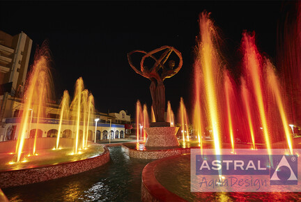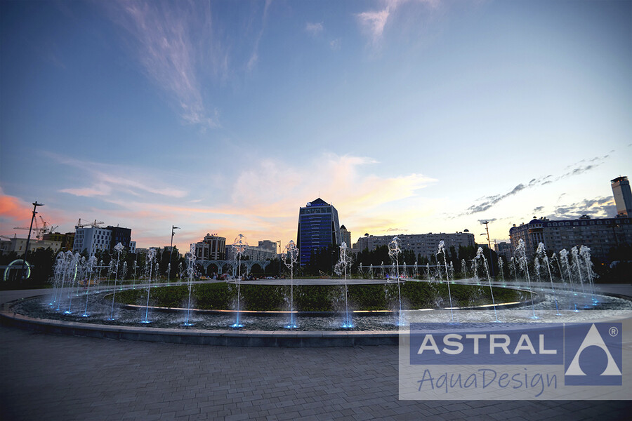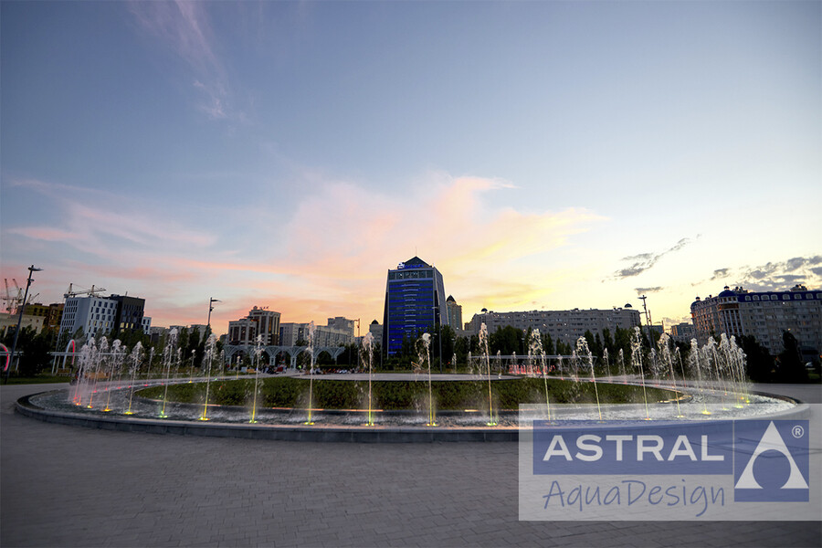 Классический фонтан простроен напротив Центра Назарбаева в Нур-Султане (Казахстан). Чаша представляет собой неполный круг. Ее дополняют клумба и подиум. По всему периметру установлено 56 форсунок SPEAR NOZZLE из нержавеющей стали. Они создают ряд струй достигающих высоты 4 метра. Их дополняют 112 форсунок Spraying jet 3/8”. Подсветка фонтана выполняется при помощи 112 подводных LED светильников RGB+W, управляемых по протоколу DMX. Они могут создавать более 16.000.000 цветовых оттенков.